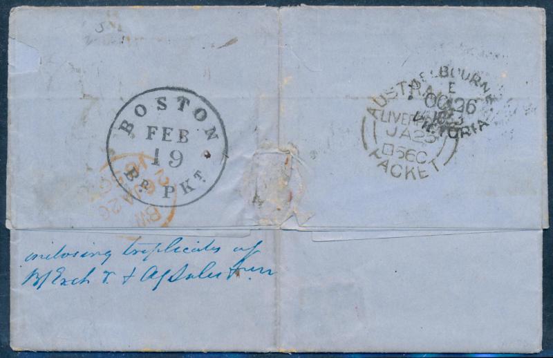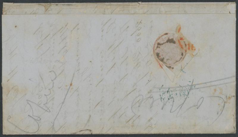in the same ink and rated "1/-" for inwards ship letter & inland delivery, some spotting & part-flap missing poorly repaired with hinges affecting the Victorian markings. Ex John Barwis. Carried by the barque 'Andromeda' departing Melbourne 8.1.1854.