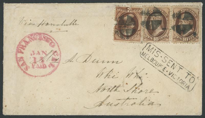 (damaged before being affixed) & 10c Jefferson horizontal pair (straight-edge at right & creased at upper-right) with cork cancels and 'SAN FRANCISCO CAL/JAN/15/PAID' cds (33mm) in red at left, to "Whi Whi/North Shore/Australia" with Melbourne