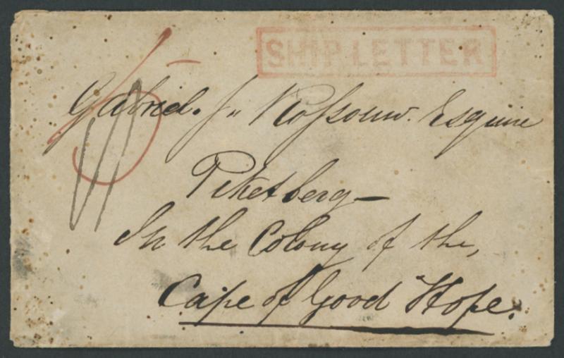 1854 (Jan 6) stampless envelope to "Piketberg in the Colony of the Cape of Good Hope", rated "5"[d] in red for 2d inland letter
