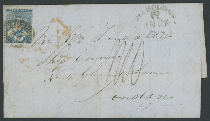 London with QV Half-Lengths 3d blue (margins close to good) unusually at upper-left tied by largely very fine Barred Oval '1' cancel and crowned-oval 'MELBOURNE/VICTORIA' datestamp at upper-right, London arrival backstamp of '29MR29/1854' where rated