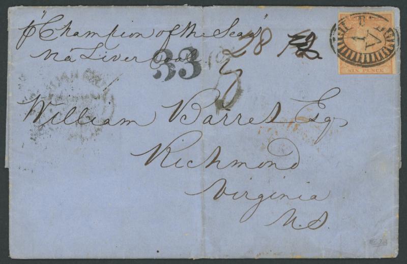 1855 (Oct 26) entire letter to Virginia USA endorsed "p Sovereign of the Seas via Liverpool" with QV Woodblocks 6d orange (touched