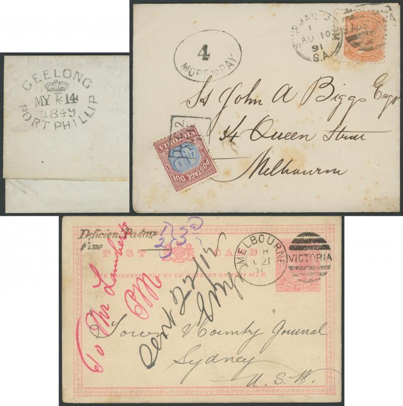 Selection with three pre-stamp entires one with superb oval 'GEELONG/[crown]/PORT PHILLIP', 1850 Melbourne to Gippsland with 'TOO