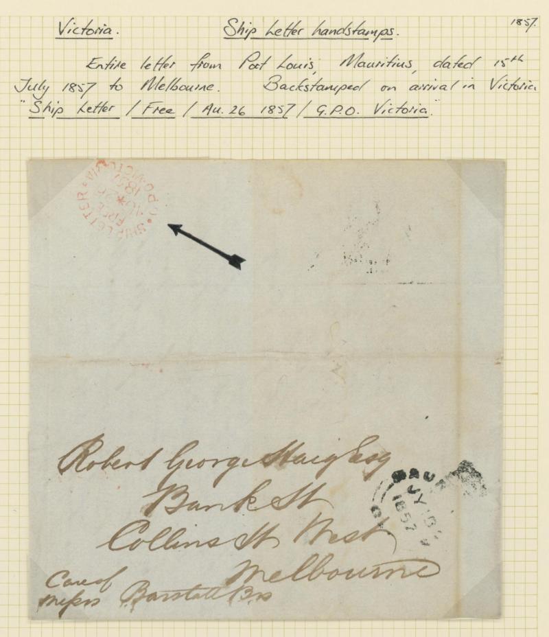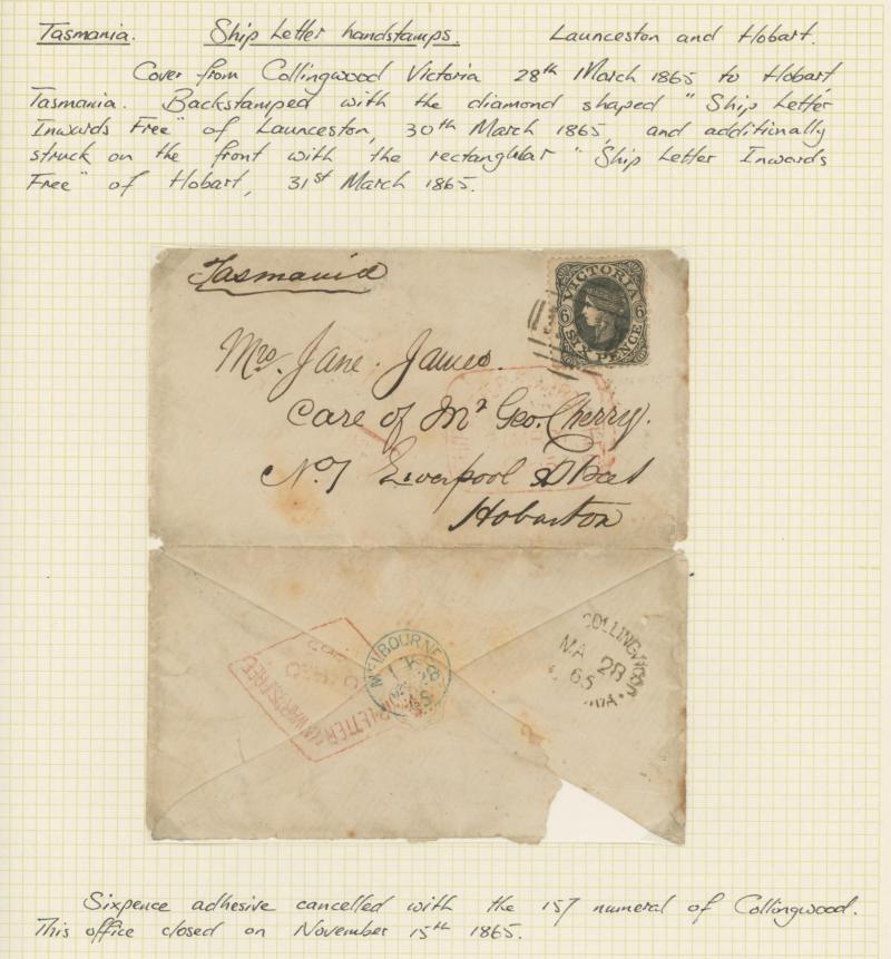 LATE' handstamp, 1852 with JB Wilcocks forwarding agent's cachet, and 1857 from Mauritius with 'SHIP LETTER/G.P.O. VICTORIA' arrival (all these ex Purves), then 1857 to Tasmania with 6d tied BN '157' and '[ ___ ] COLLINGWOOD' ('EAST' excised) oval