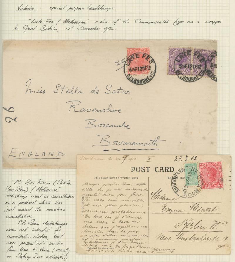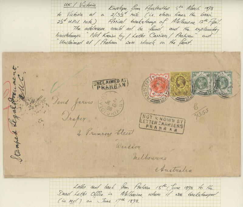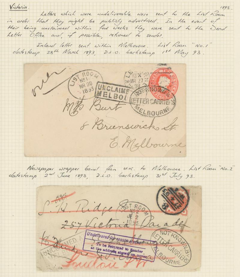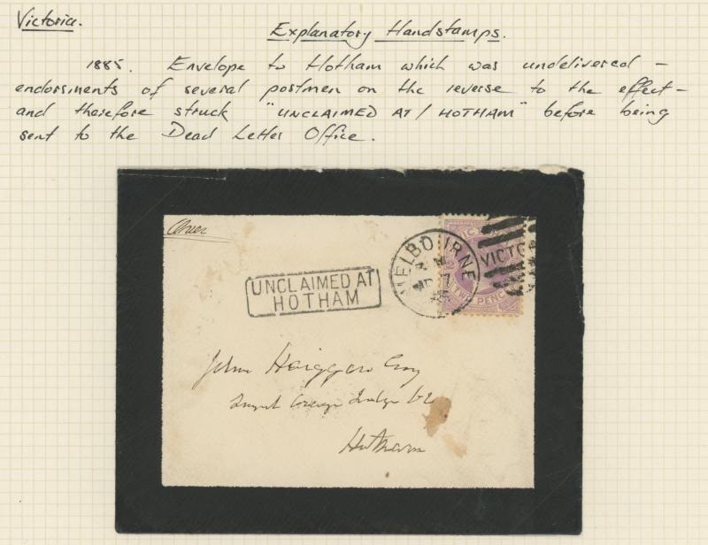 markings noted 1885 'UNCLAIMED AT/HOTHAM' on mourning envelope, Melbourne 'LIST ROOM/No1' & '.../No2' oval datestamps on two 1893 unclaimed items, 1898 from Great Britain with ½d 3d & 1/- green pair 'UNCLAIMED AT/PRAHRAN', advertising envelopes,