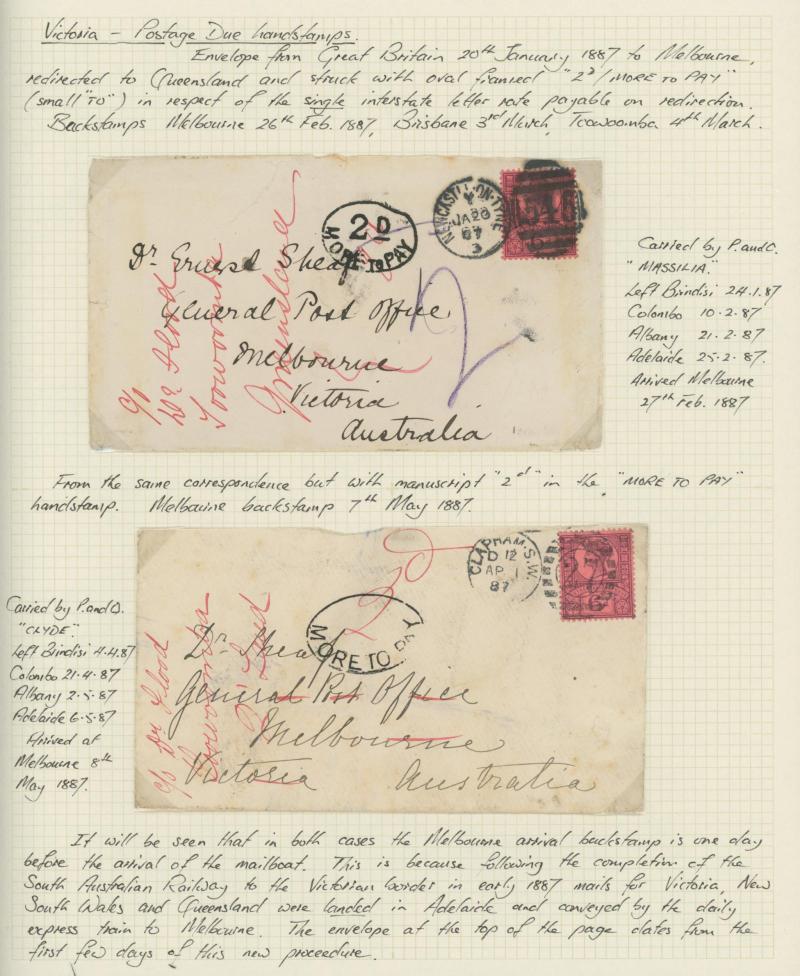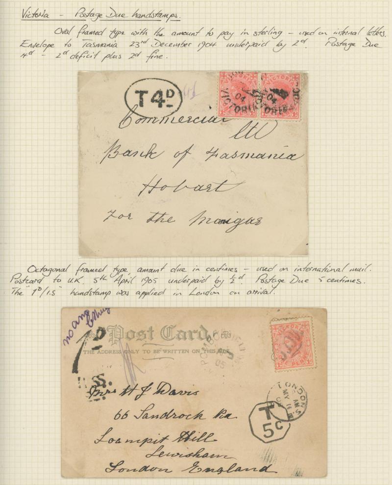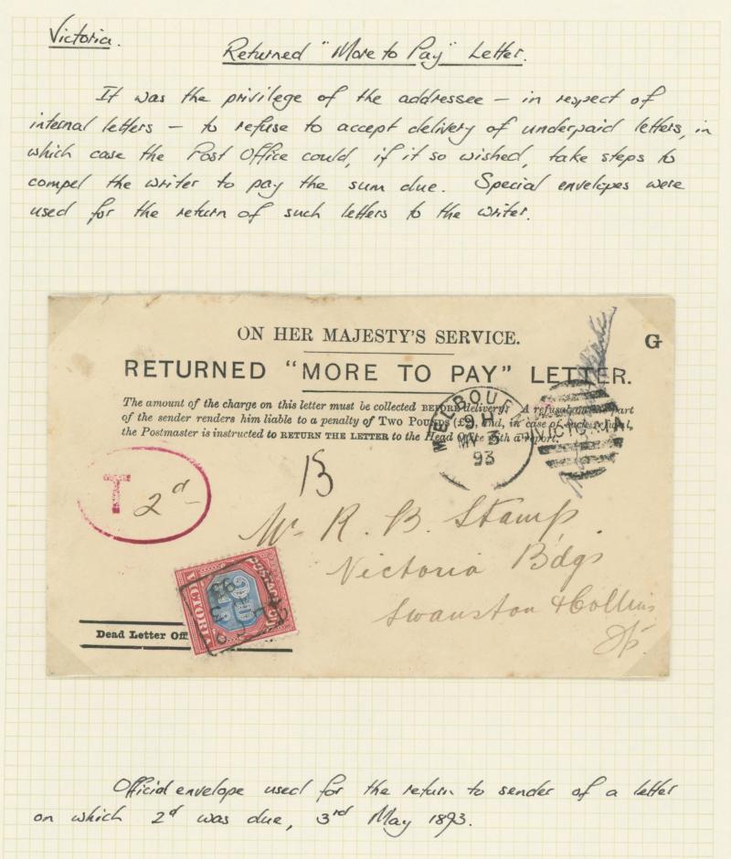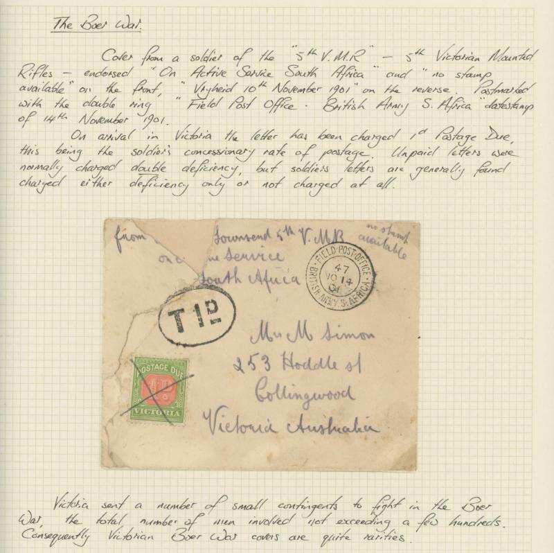 Pay" Letter OHMS envelope with Postage Due 2d blue & claret, also 1901 Boer War inwards envelope (faulty) with Postage Due 1d red & green, 1906 postcard from South Australia re-addressed with Victoria 1d pink added and 'BUNYIP' arrival, 1910 Great
