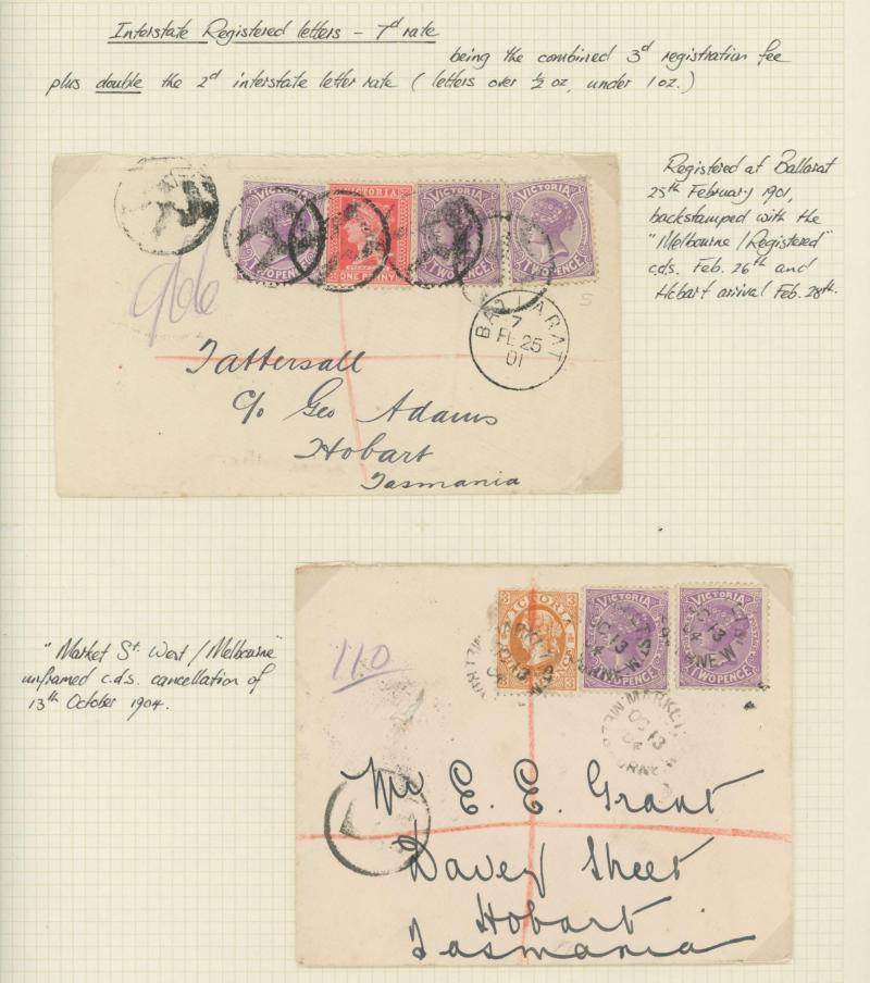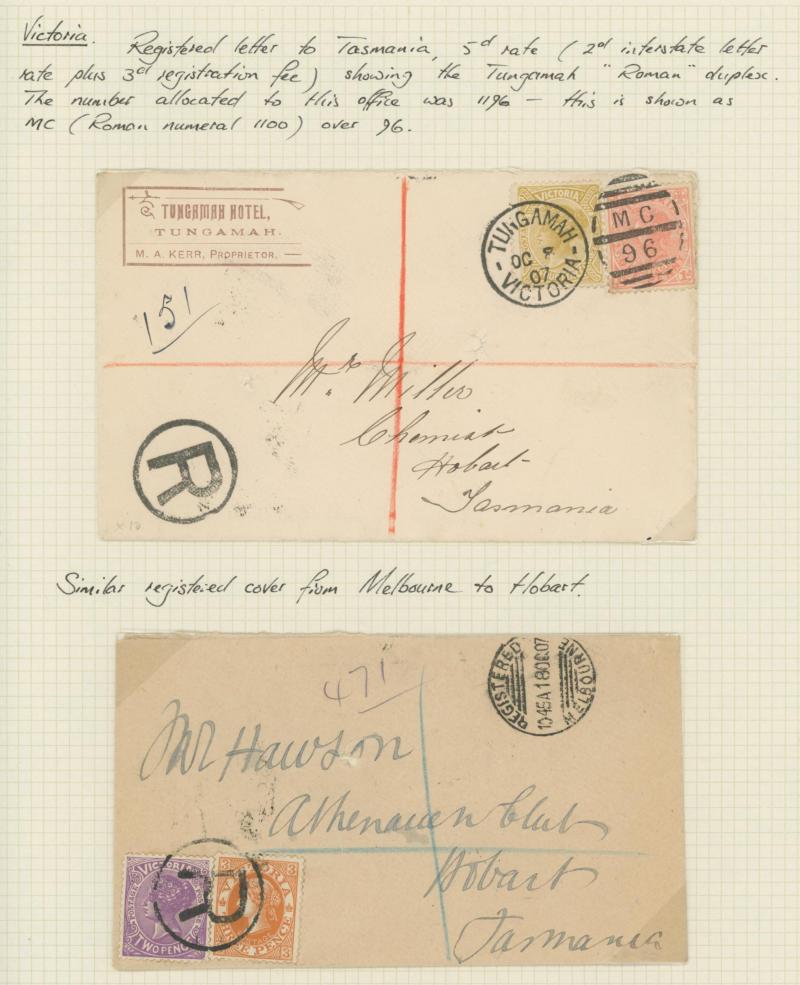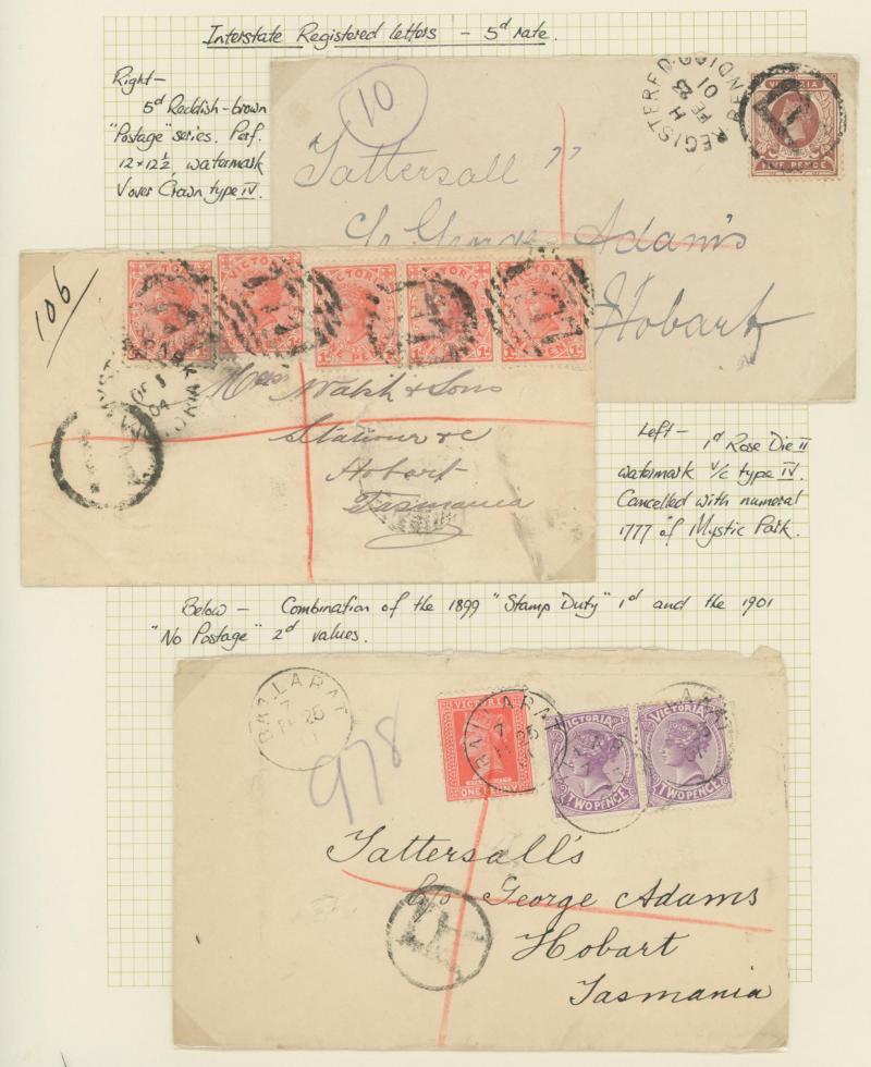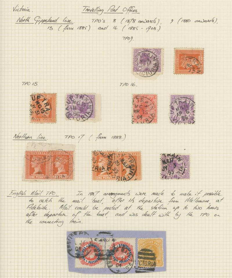 Britain Registration Envelope from Glasgow to Melbourne with 'ENGLISH MAIL T.P.O.' transit plus a few TPO cancels on stamps including 5/- pair on piece, Tatts mail, etc, condition a little variable but most are quite presentable.