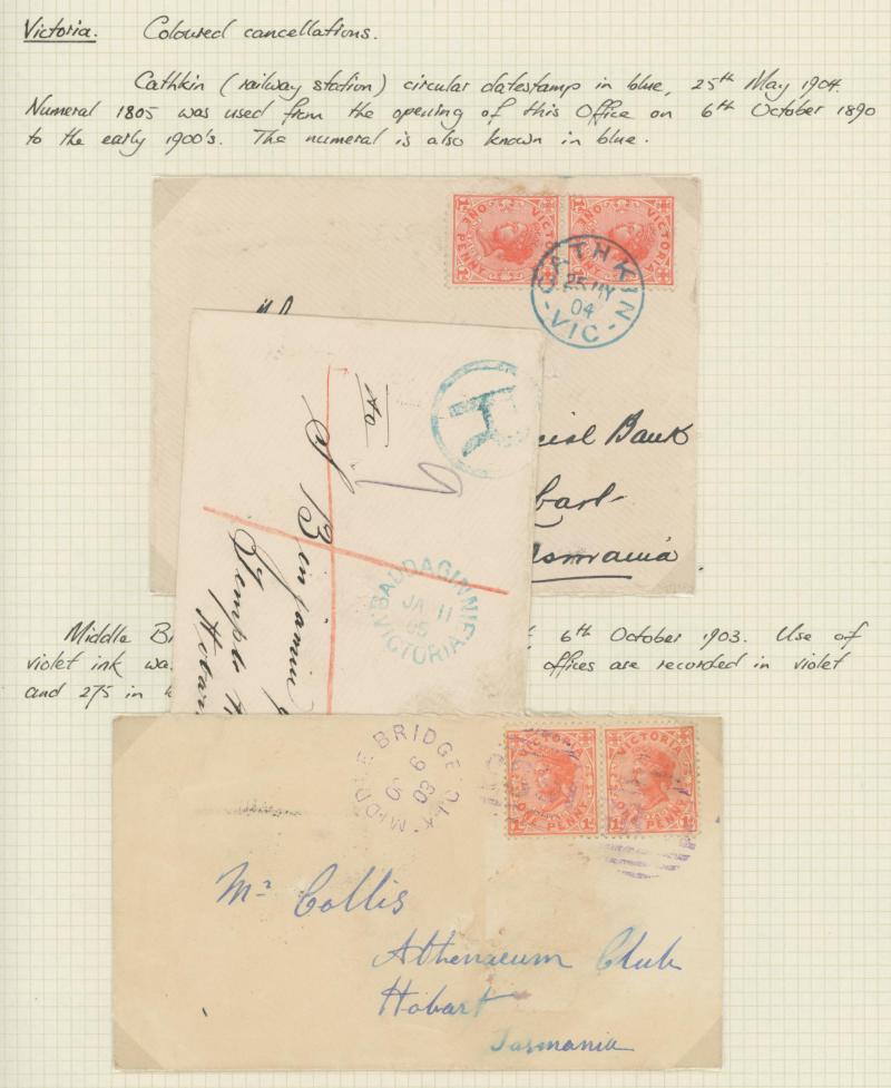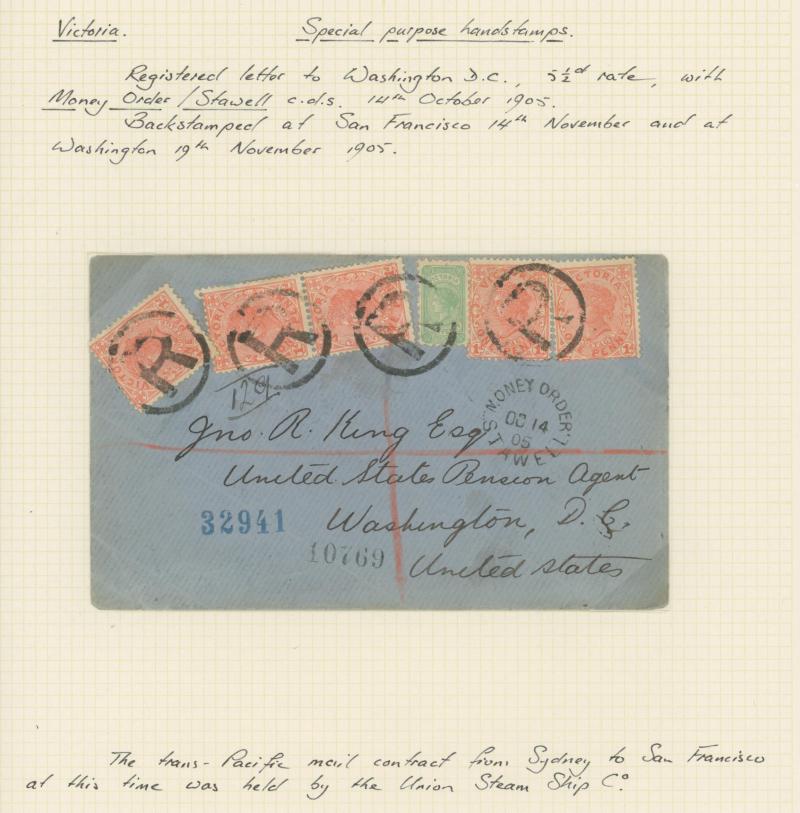backstamp and later items with plenty of other postmark interest such as 'BADDAGINNIE' & 'CATHKIN' in blue and 'MIDDLE BRIDGE' in violet tied to just-legible BN '1685', 1905 registered to USA with 'MONEY ORDER/STAWELL' cds, also instructional