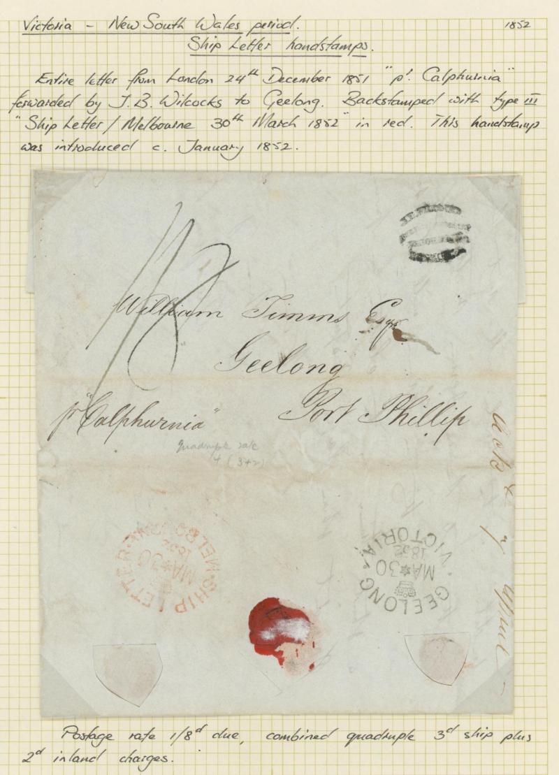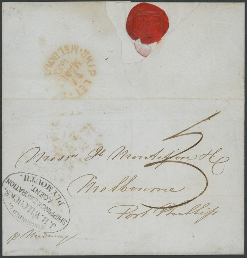 WILCOCKS/SHIPPING & EMIGRATION/AGENT/PLYMOUTH' framed-oval handstamp on the face, carried per favor and placed into the mails on arrival where rated "3"[d] postage due and largely fine 'SHIP LETTER/MA*17/1853/MELBOURNE' crowned datestamp in red on