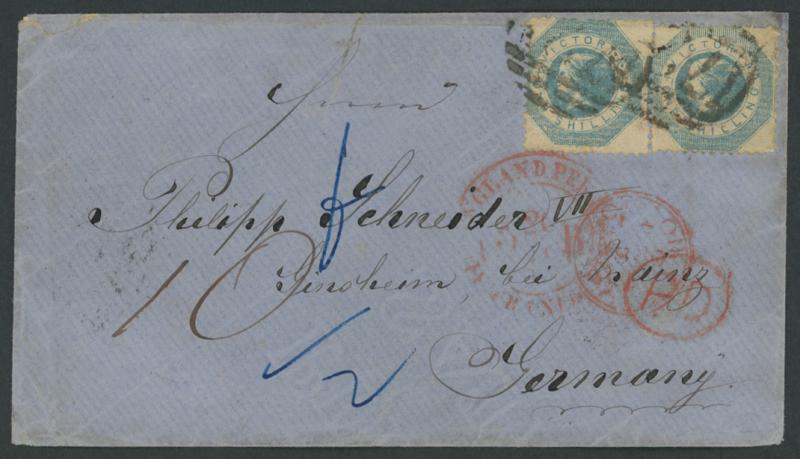 1863 (Sept 5) envelope to Ginsheim, Mainz, Germany with QV Octagonal 1/- blue x2 tied by fair to fine strikes of Barred Numeral
