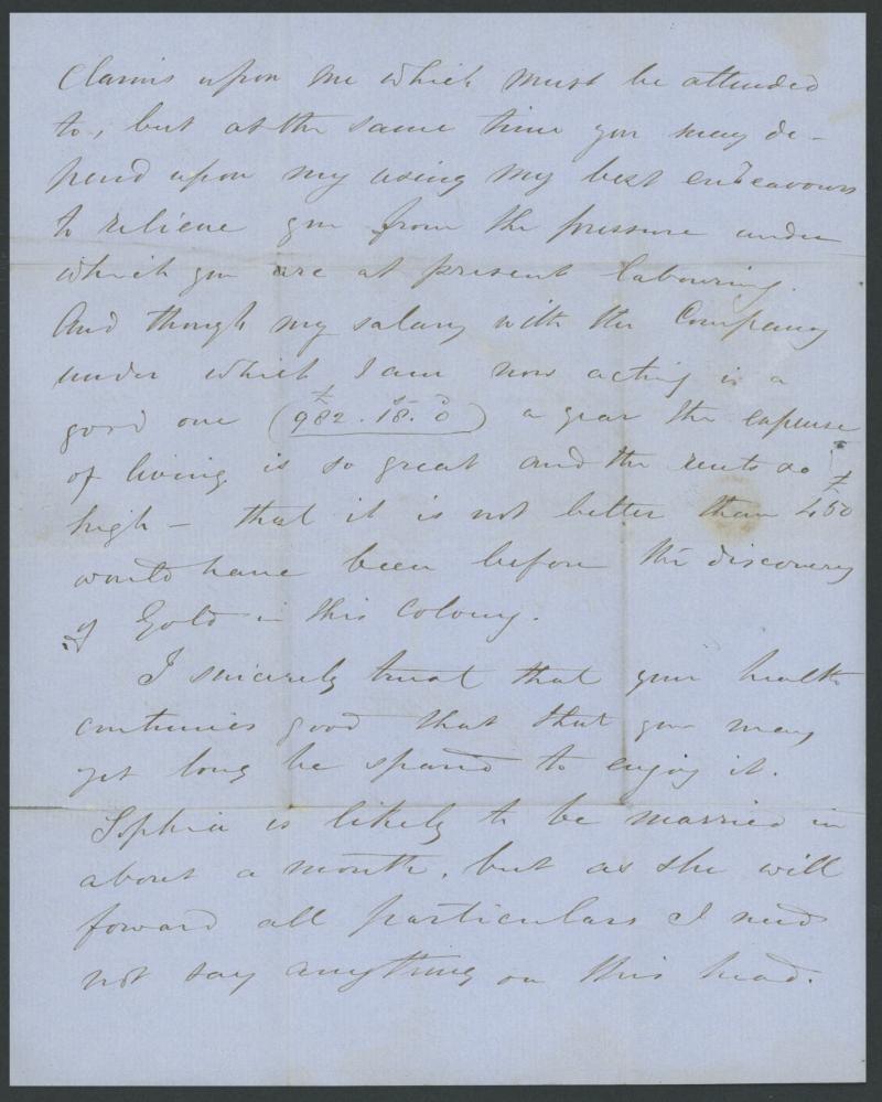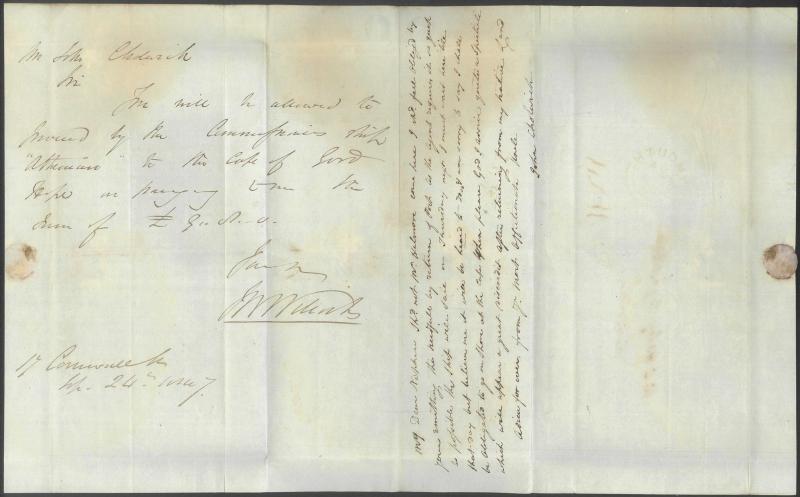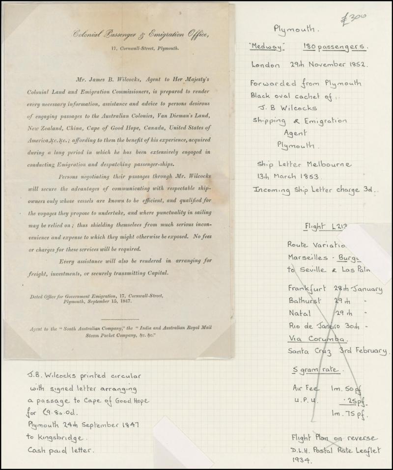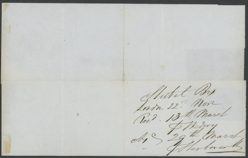 the reverse, ironed-out folds one lightly affecting the handstamp. Plus Wilcocks circular advertising services to migrants to 'the Australian Colonies, Van Dieman's Land, New Zealand, China, Cape of Good Hope, Canada, United States of America, etc,