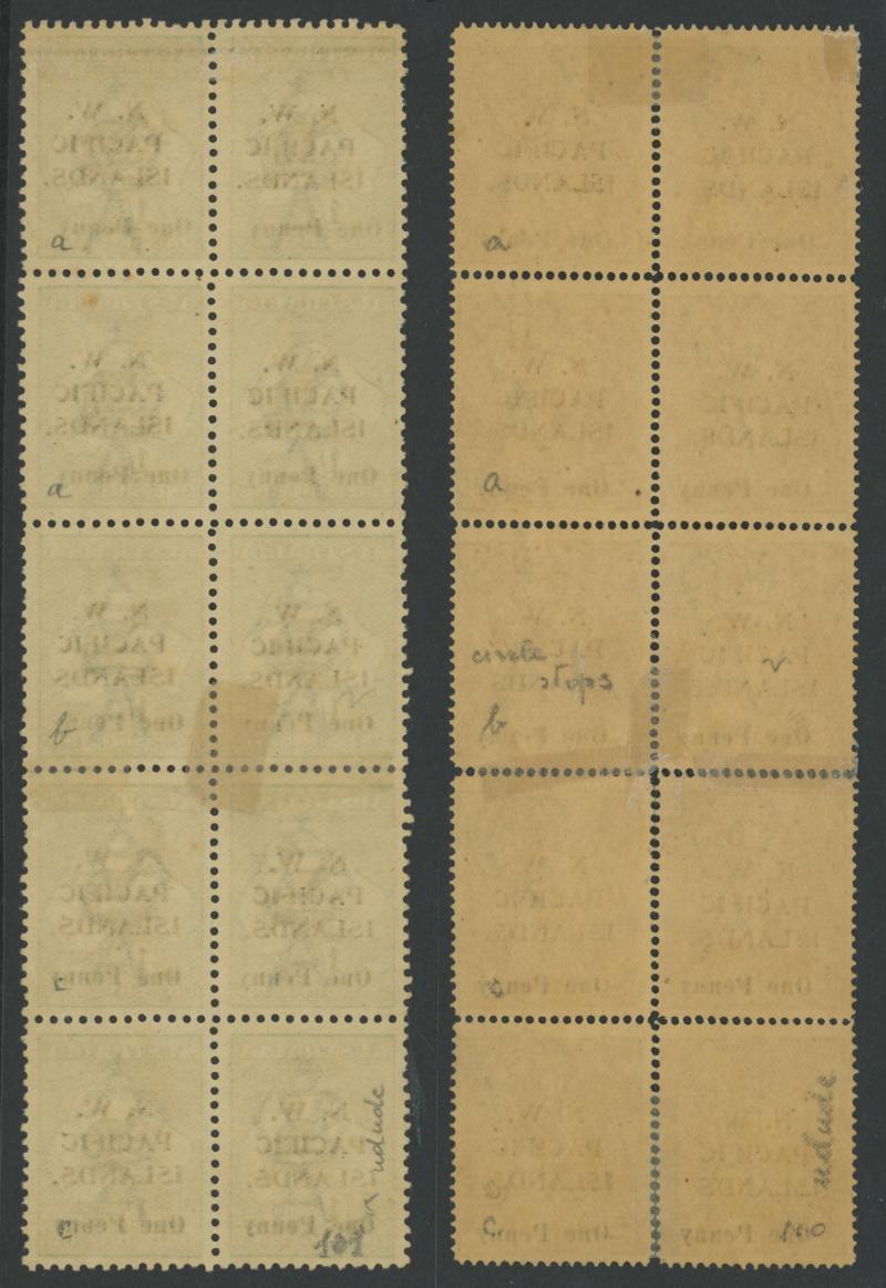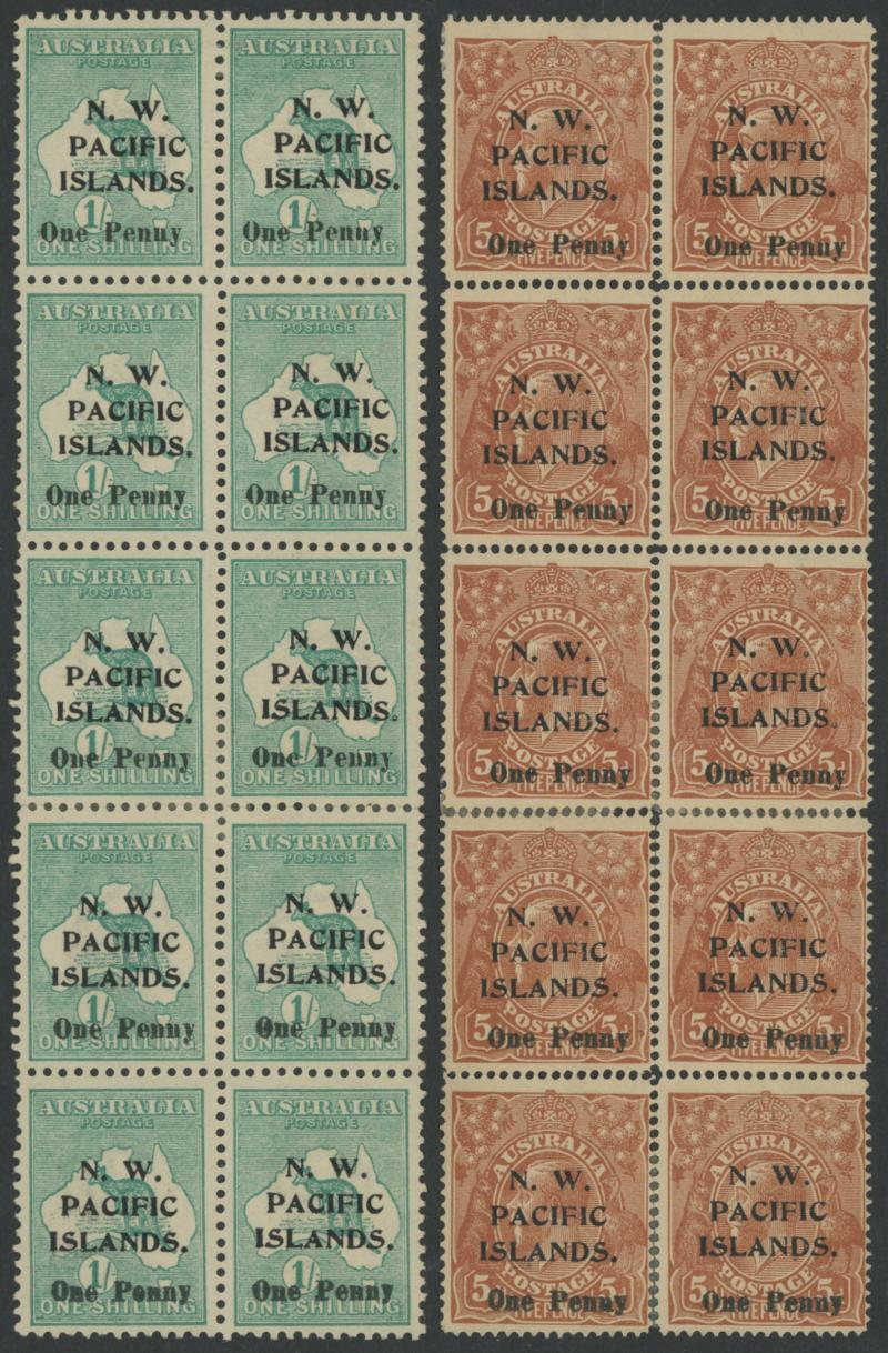 1918 Surcharges 'One Penny' on KGV 5d brown SG 100 and 'One Penny' on Kangaroos 1/- green 101 blocks of 10 (2x5) each comprising
