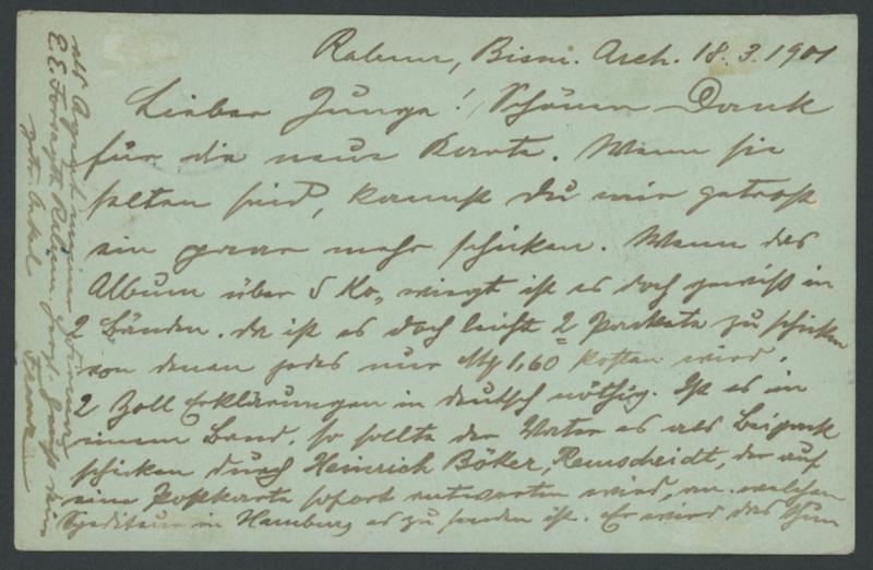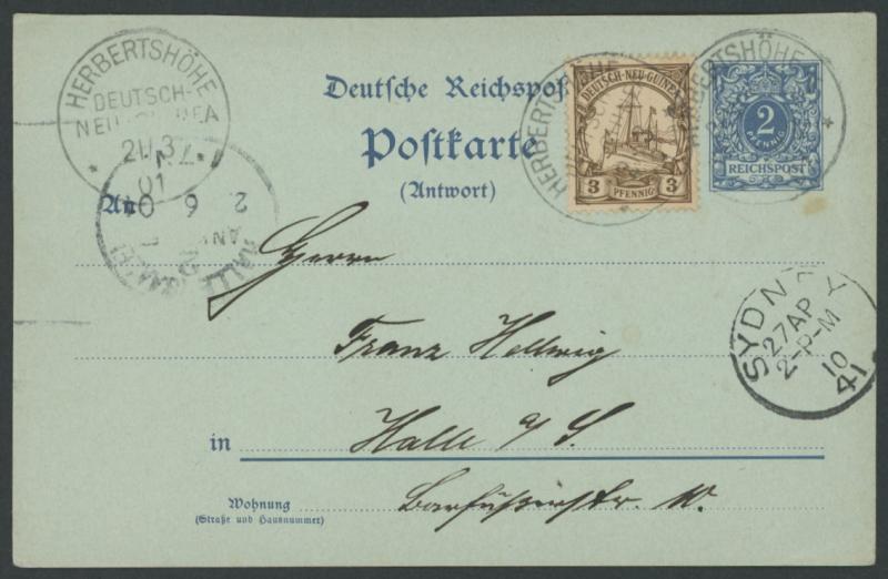 'HALLE(SAALE)/ANKUNFT/2.6.01' arrival both on the face, a couple of very minor blemishes. The reply card was valid for use from German New Guinea, and the added franking sufficed for the 5pf postcard rate to German territories. (Image1) (Image2)