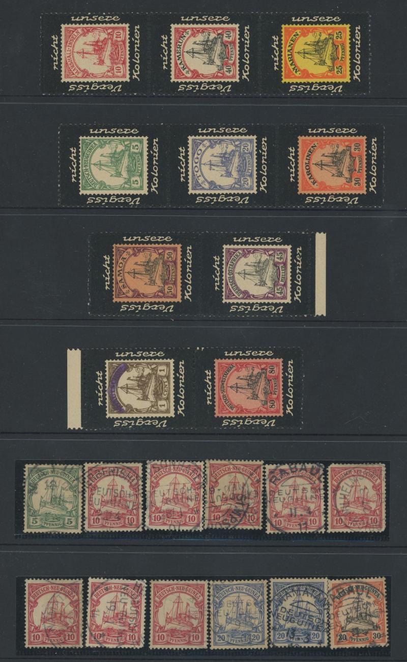 & Rabaul Post Office Seal, German New Guinea 'Mourning' Cinderella x5 one mounted on page from illustrated book plus 'Lost Colonies' set, Postal Cards including Yachts 5pf green 1912 social usage to Germany with lengthy message, various others