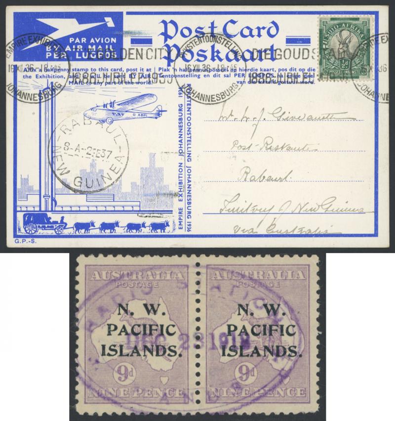 South Africa airmail postcard with Rabaul arrival cds, etc, condition a little variable but generally fine to very fine.