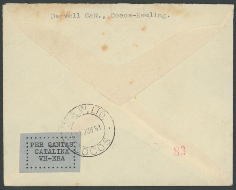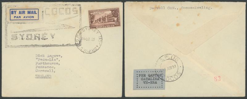 1951 (June 11) Qantas return flight Cocos-Sydney envelope AAMC 1273c envelope with Darvell, Cocos return address on back flap, to