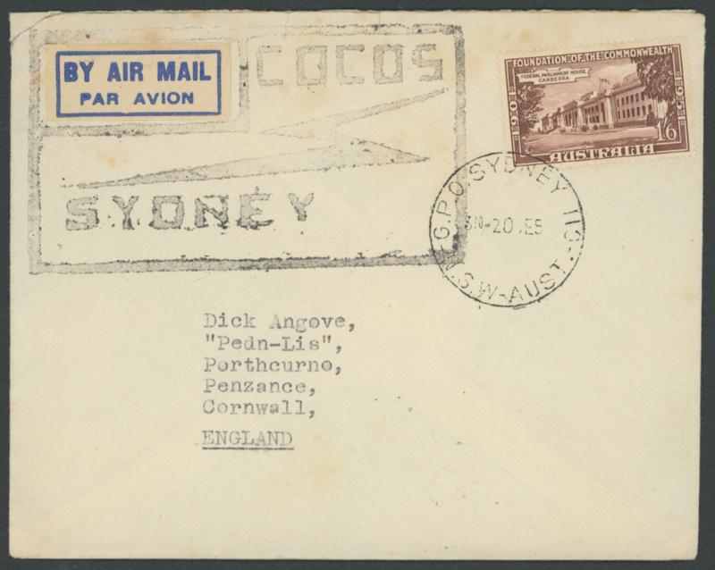 England with Australia 1/6d Parliament House tied by Sydney cds in transit, type-written 'PER QANTAS/CATALINA/VH-EBA' label tied to reverse by largely very fine strike of the 'C.& W.LTD/11JUN51/COCOS' double-circle cds, small closed edge tears and a