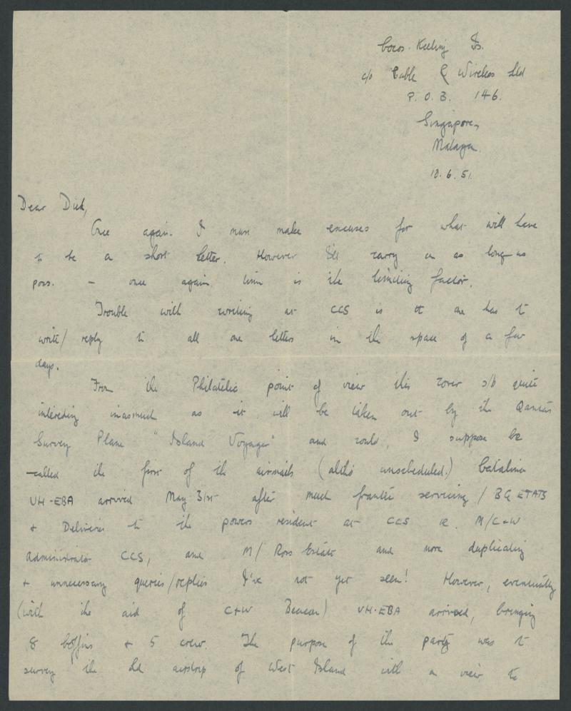 The enclosed lengthy letter from Bob Darvell of Cable & Wireless includes such snippets as "[this cover] will be taken out by the Qantas Survey Plane 'Island Voyager', ... Catalina UH-EBA arrived May 31st after much frantic servicing ... to survey