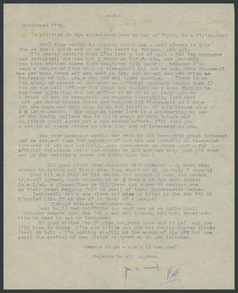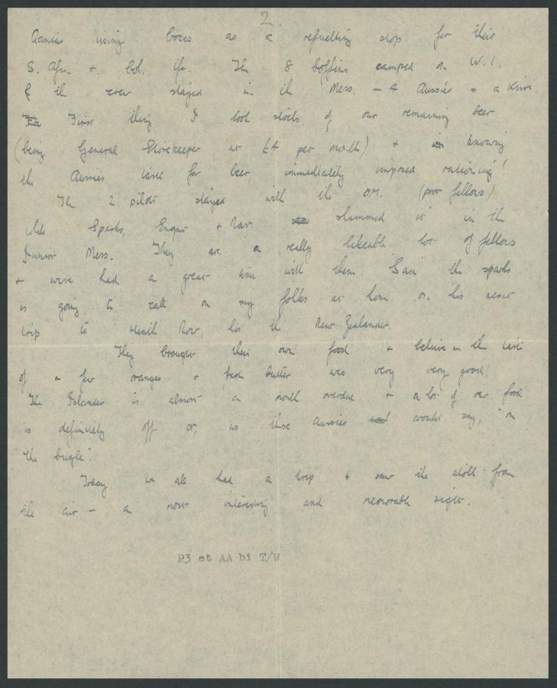 Aussies taste for beer immediately imposed rationing! ... today we all had a trip [on the flying boat] & saw the atoll from the air ... first tincanmail was per Wave Baron abt sec week in Jan, and second was per Orion beginning of Apl ... there is no