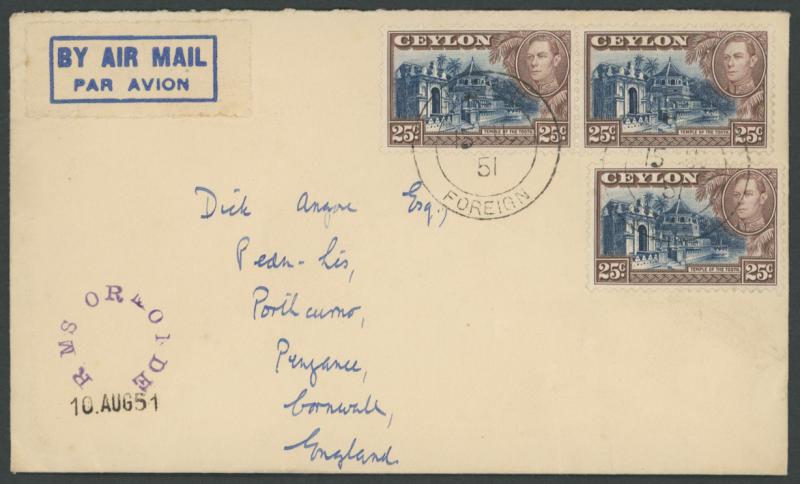 rare 'R MS ORMONDE' circular cachet in violet over '10AUG51' handstamp at lower-left, franked with Ceylon KGVI 25c Temple x3 tied by Colombo '15AU/51' cds, short note from Bob Darvell of Cable & Wireless enclosed, a couple of minor transmission