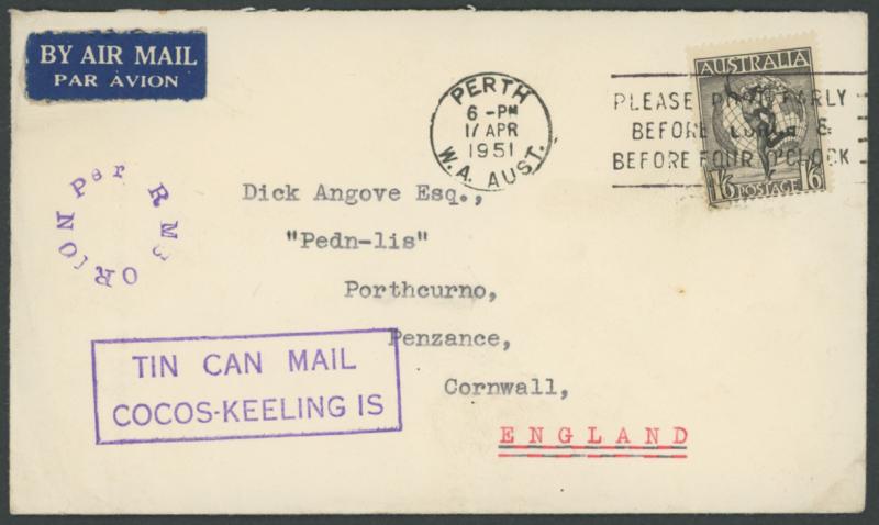 strike of the 'Per RMS ORION' circular cachet over 'TIN CAN MAIL/COCOS-KEELING IS' boxed cachet both in violet, Australia 1/6d Hermes (minor corner fault) tied by Perth '17 APR/1951' slogan cancel, a few minor transmission marks. Ex Dr William Wells.