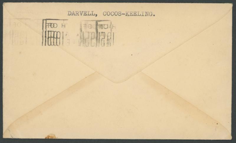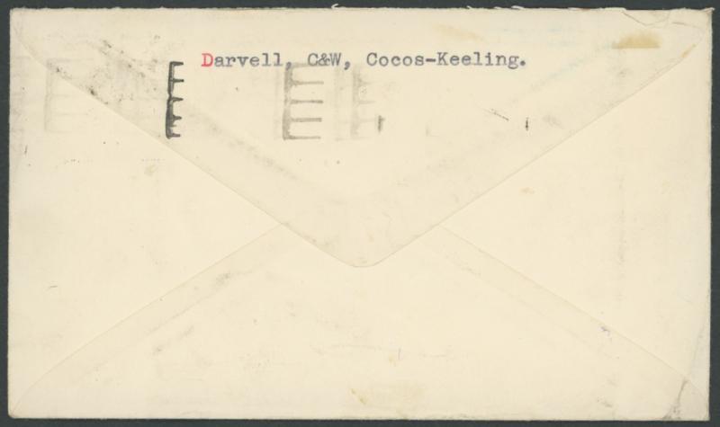 1951 (Aug 10) envelope with Darvell, Cocos return address on back flap, airmail to England with a largely very fine strike of the