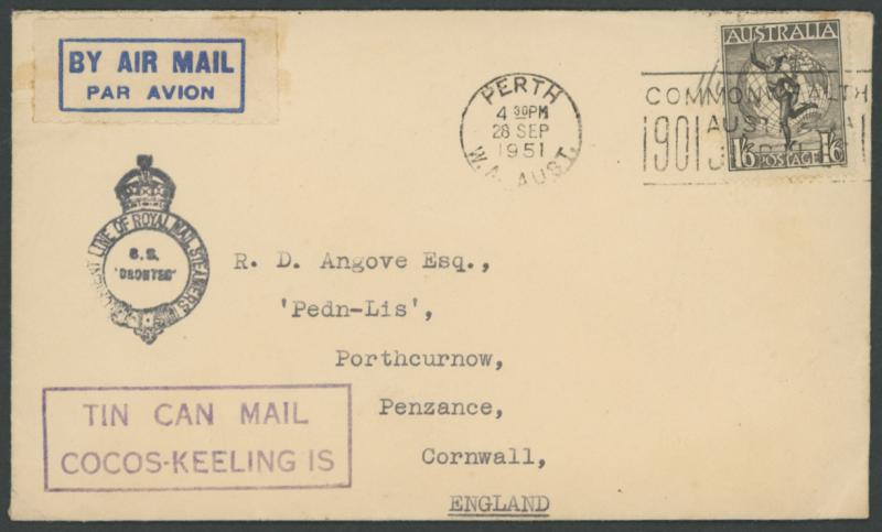 of the Orient Line SS 'Orontes' crowned cachet in black over 'TIN CAN MAIL/ COCOS-KEELING IS' boxed cachet in violet at lower-left, Australia 1/6d Hermes tied by Perth '28 SEPT/1951' slogan cancel, a few minor transmission marks. The enclosed letter