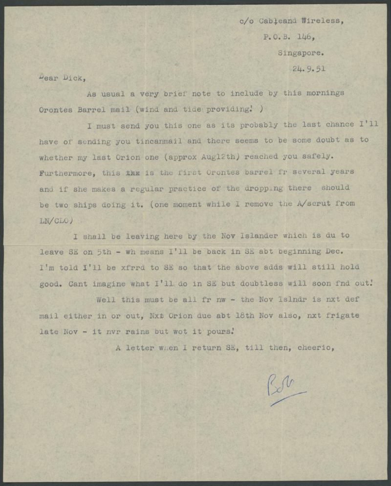 from Bob Darvell of Cable & Wireless includes "this is the first Orontes barrel for several years ... I shall be leaving here by the Nov Islander". Ex Dr William Wells. Colin Riddell's similar cover - to North Borneo (!) - sold at our auction of