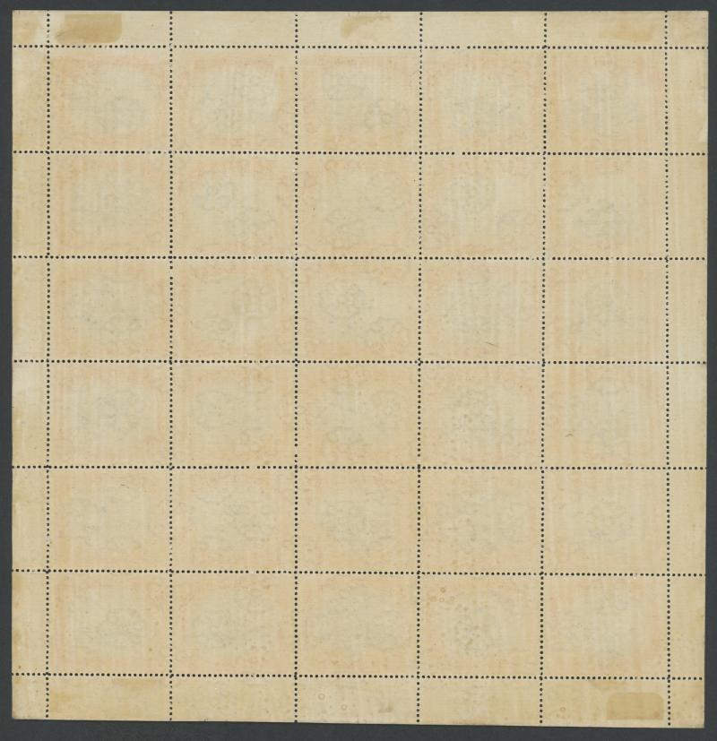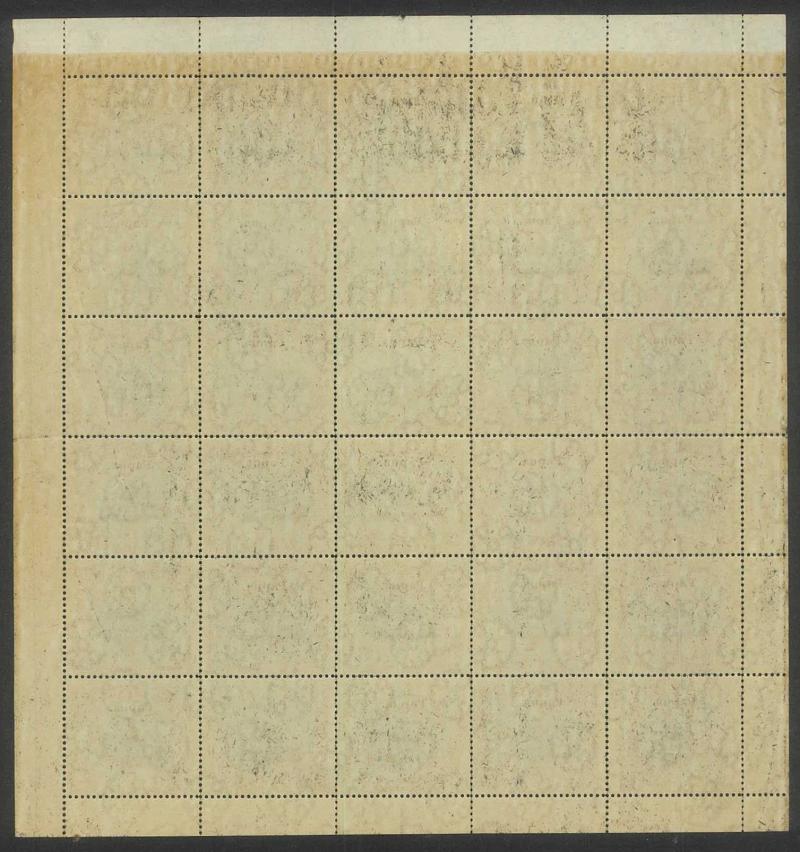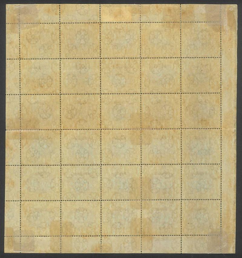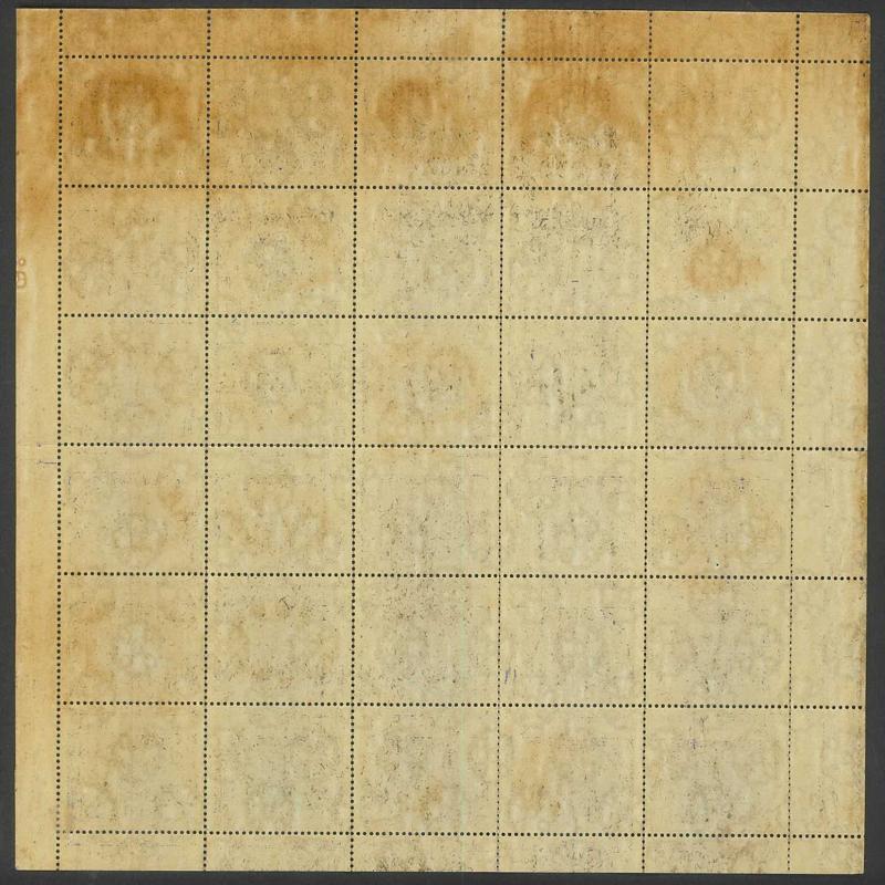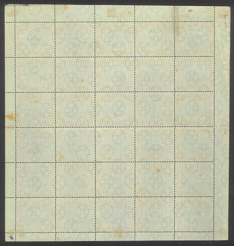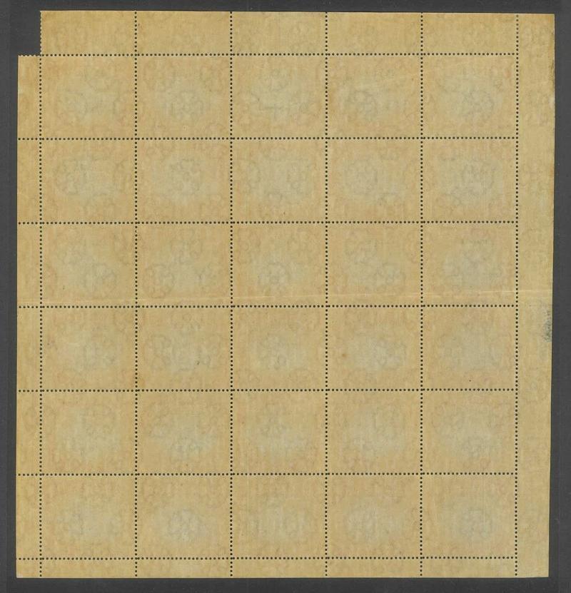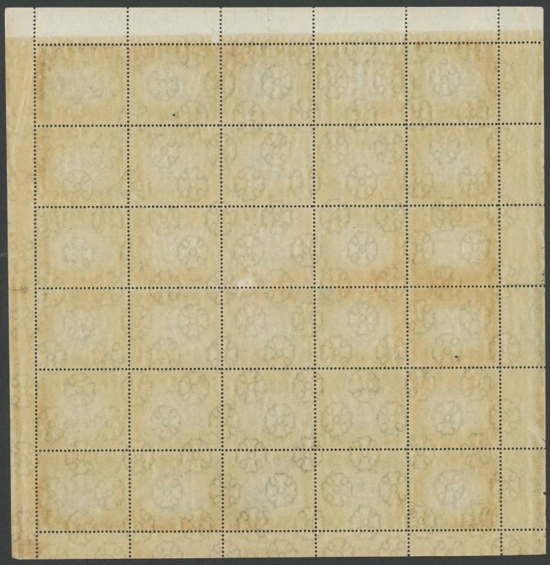sheet of 30 (5x6) with Printers' Guideline Crosses in the margins and Thin 'd' at Left [Pos 17] SG 41b (Cat from £250), White Leaves at Right [Pos 20], Unshaded Leaves at Left [Pos 27] & Sickle Flaw [Pos 28] plus overprint varieties Inverted 'd' for