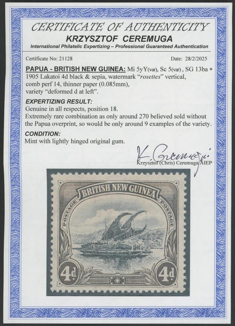 1901-05 British New Guinea Lakatois Rosettes Watermark Vertical Thin Paper Comb Perf 14 4d black & sepia with Deformed 'd' at Left