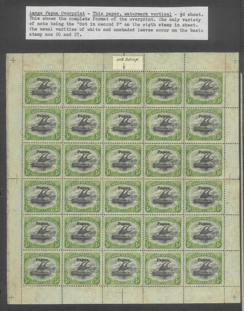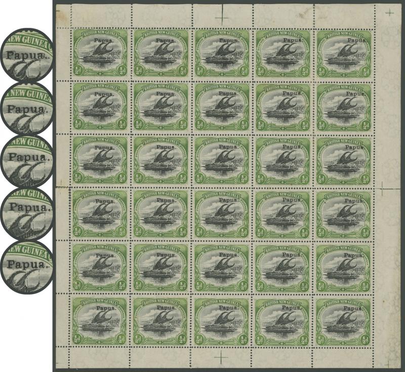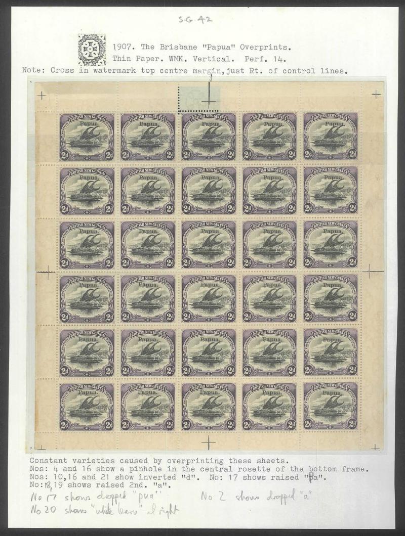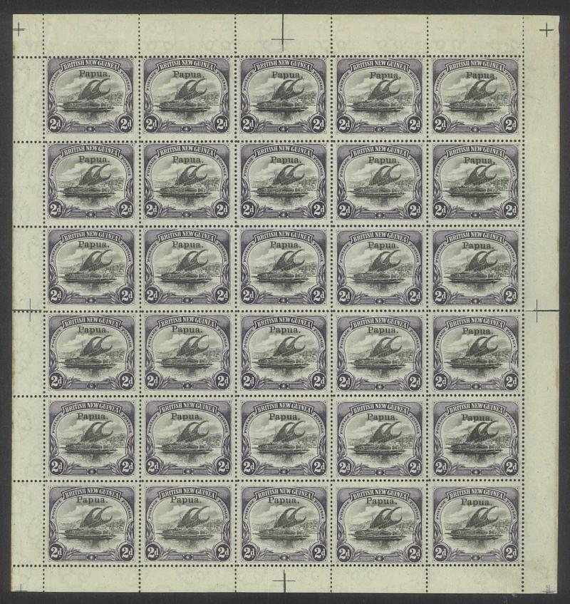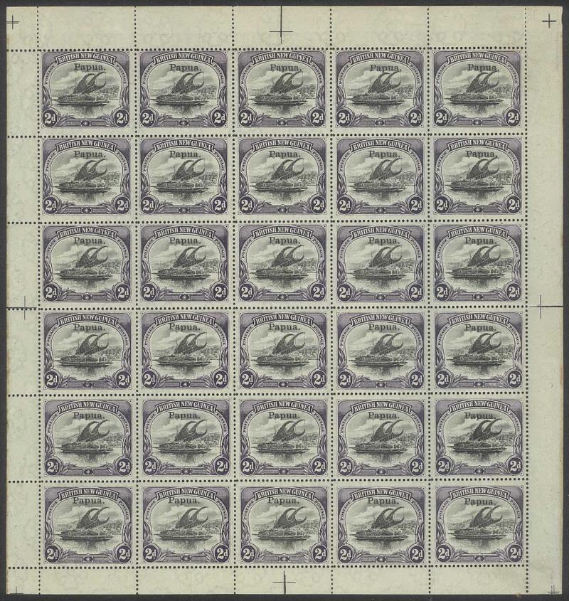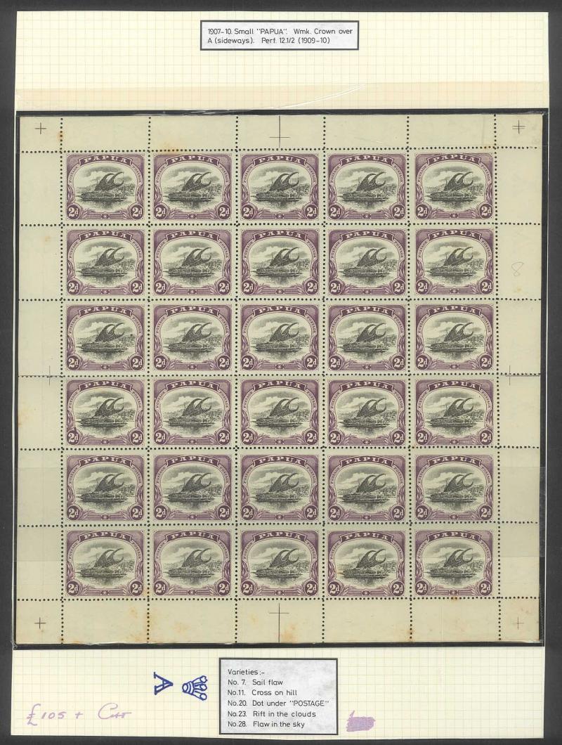 2d black & violet SG 40 x3 sheets each with overprint varieties Inverted 'd' for Second 'p' [Pos 10, 16 & 21] and Dropped 'pua.' [Pos 17] as well as Overprint Guide Pinholes in Rosette [Pos 4 & 16], also 1906 Large 'Papua.' Overprints ½d black &