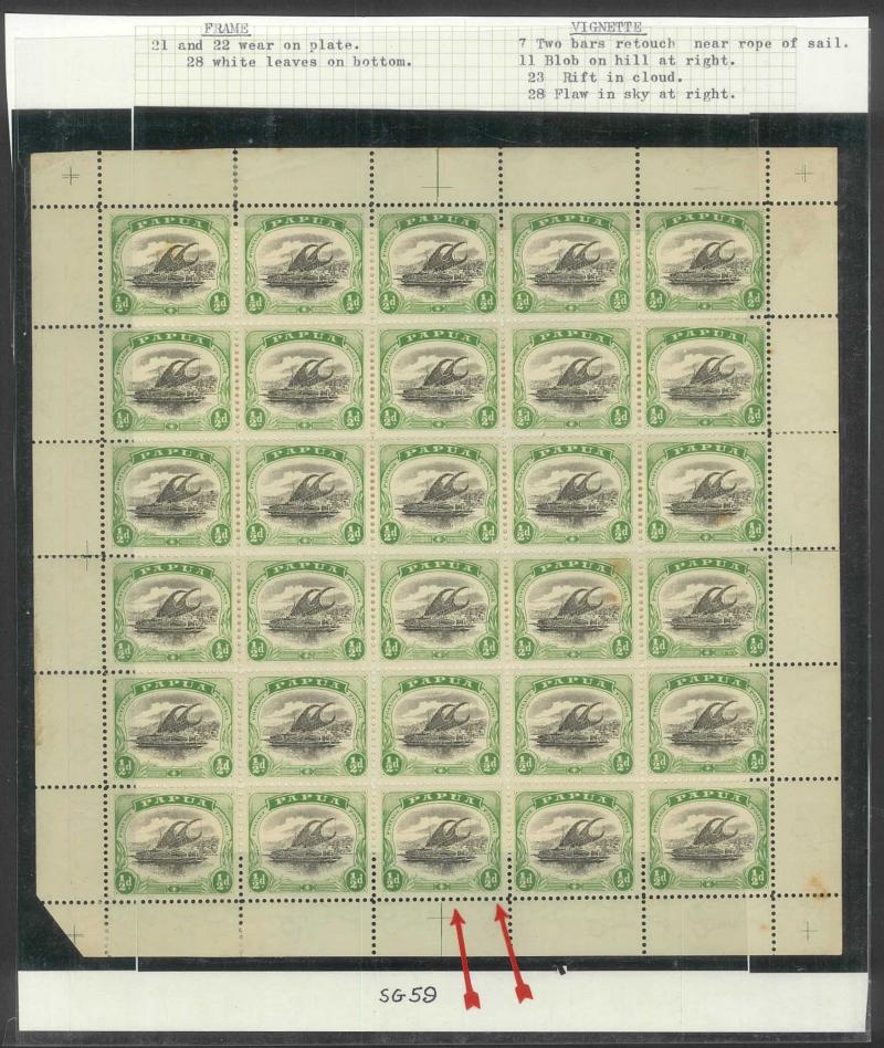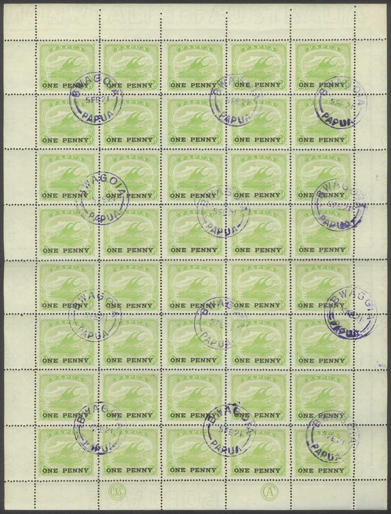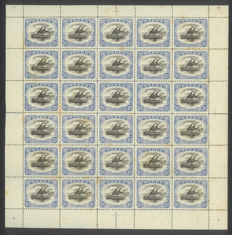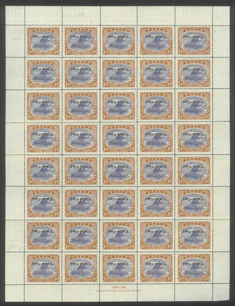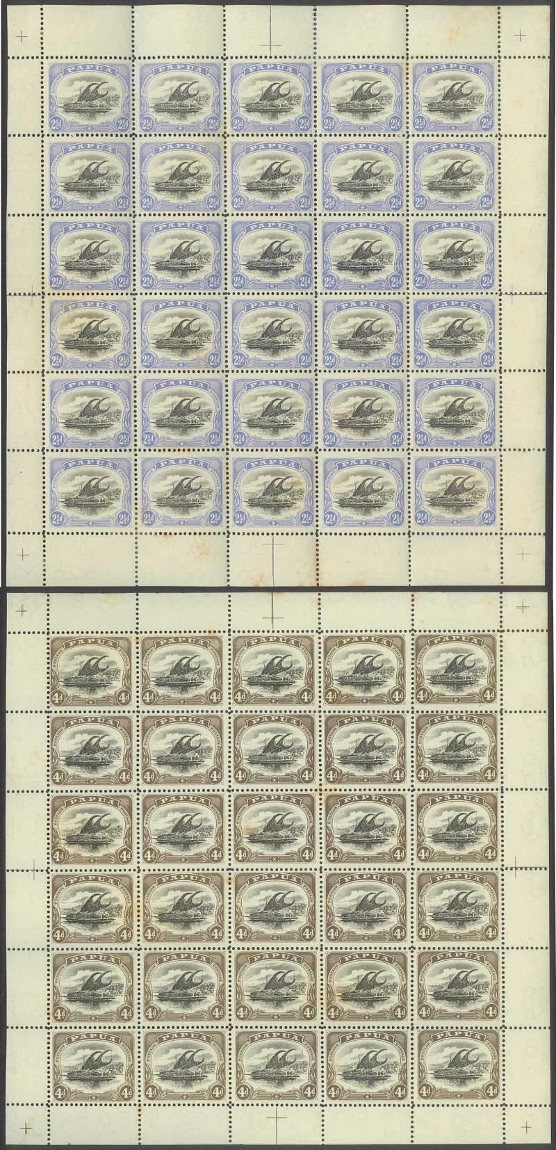 2d black & violet SG 40 x3 sheets each with overprint varieties Inverted 'd' for Second 'p' [Pos 10, 16 & 21] and Dropped 'pua.' [Pos 17] as well as Overprint Guide Pinholes in Rosette [Pos 4 & 16], also 1906 Large 'Papua.' Overprints ½d black &