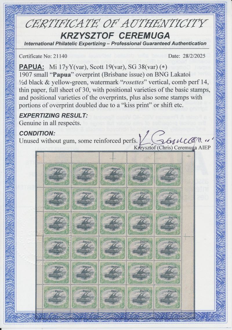 Ceremuga Certificate (2025) states “some stamps with portions of overprint doubled due to a kiss print or shift” but does not expertise it as SG 38a.