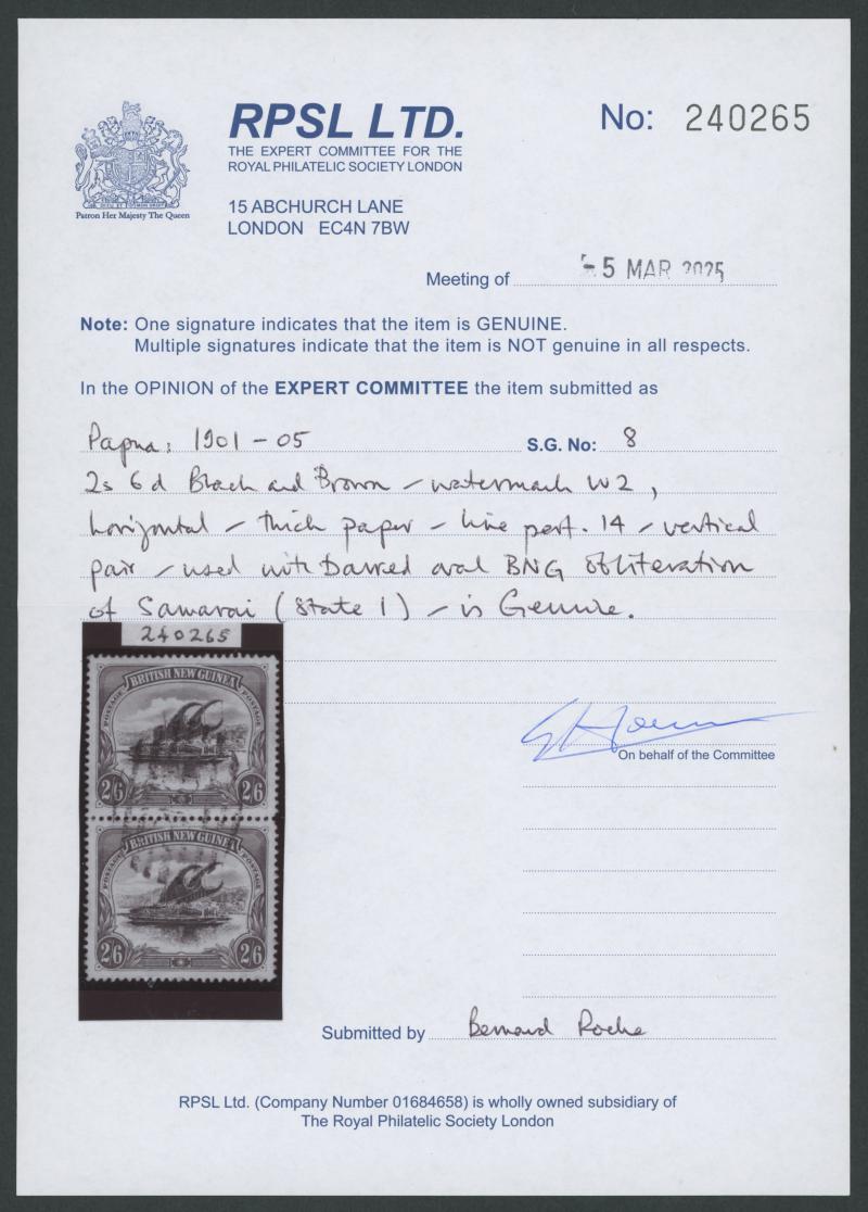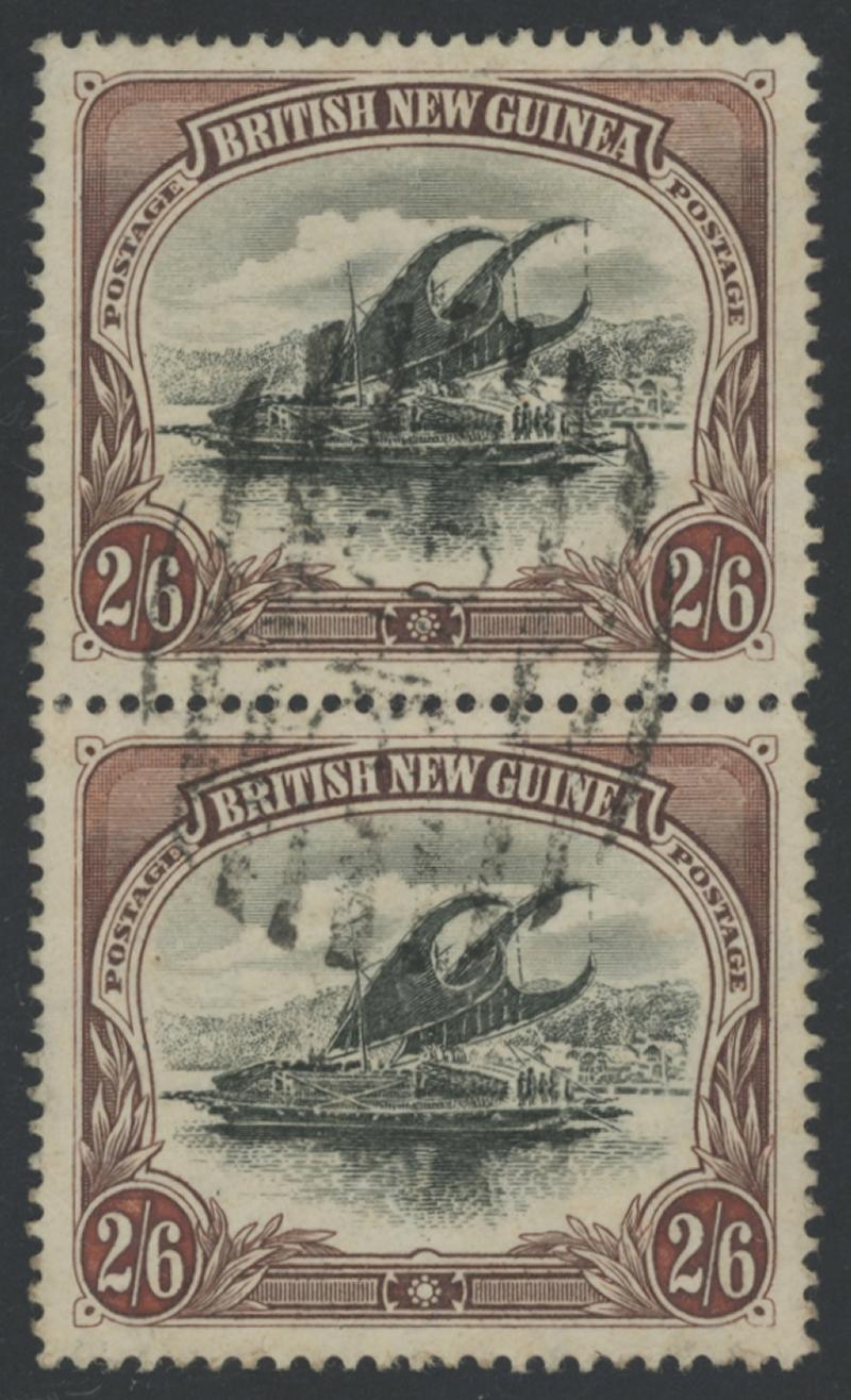 1901-05 British New Guinea Lakatois Rosettes Watermark Horizontal Thick Paper Line Perf 14 2/6d black & brown SG 8 vertical pair,
