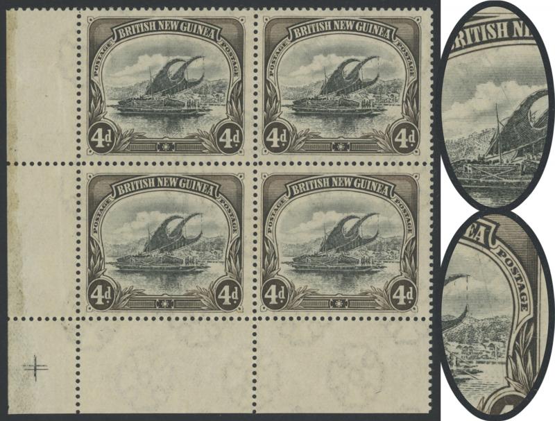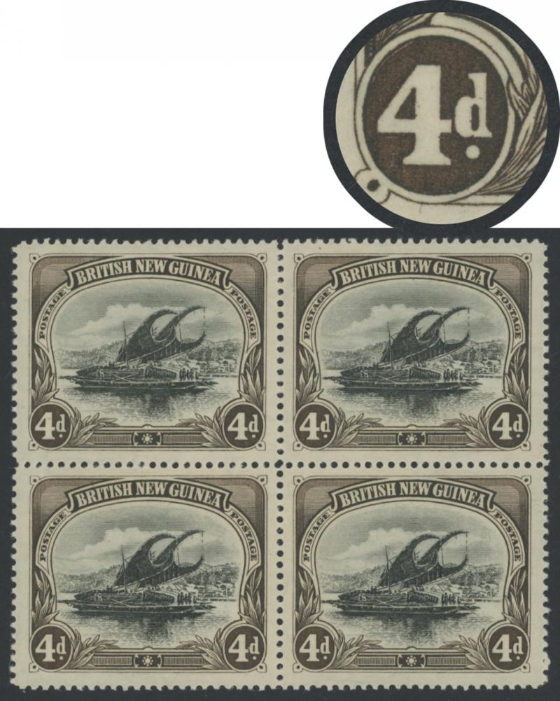 1901-05 British New Guinea Lakatois Rosettes Watermark Horizontal Thick Paper Line Perf 14 4d black & sepia SG 5 block of 4 the