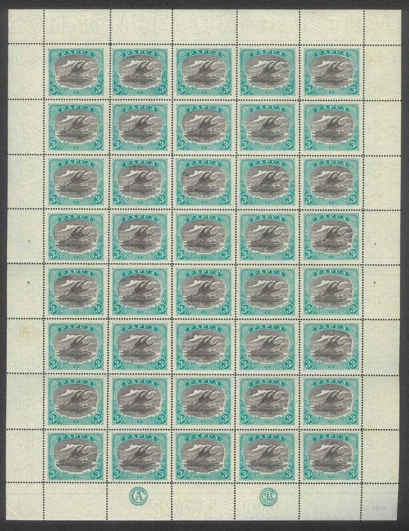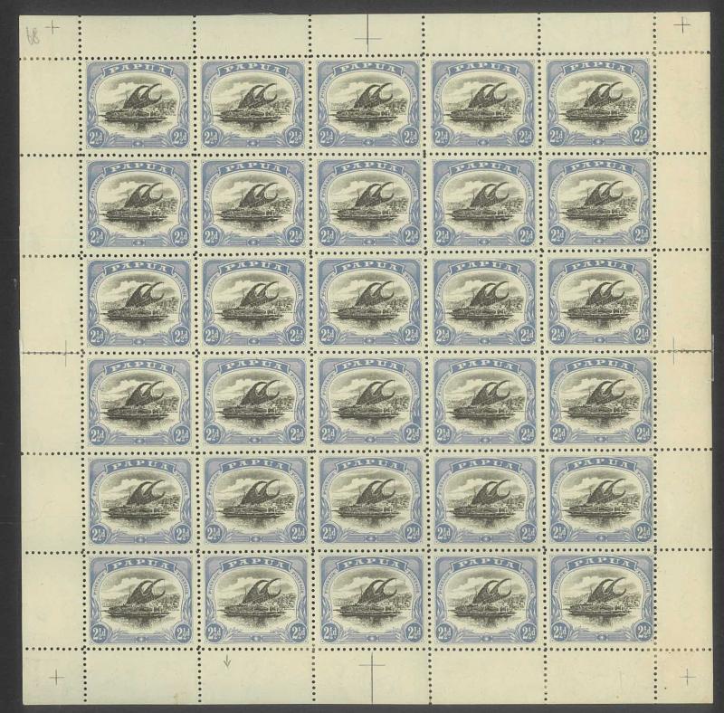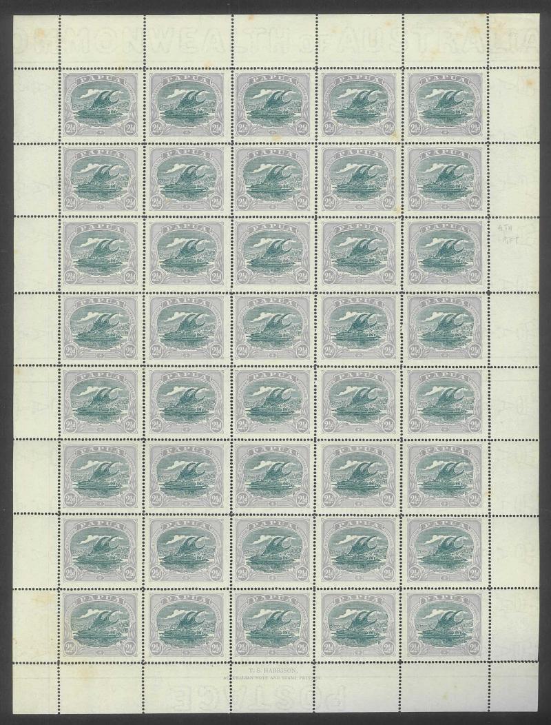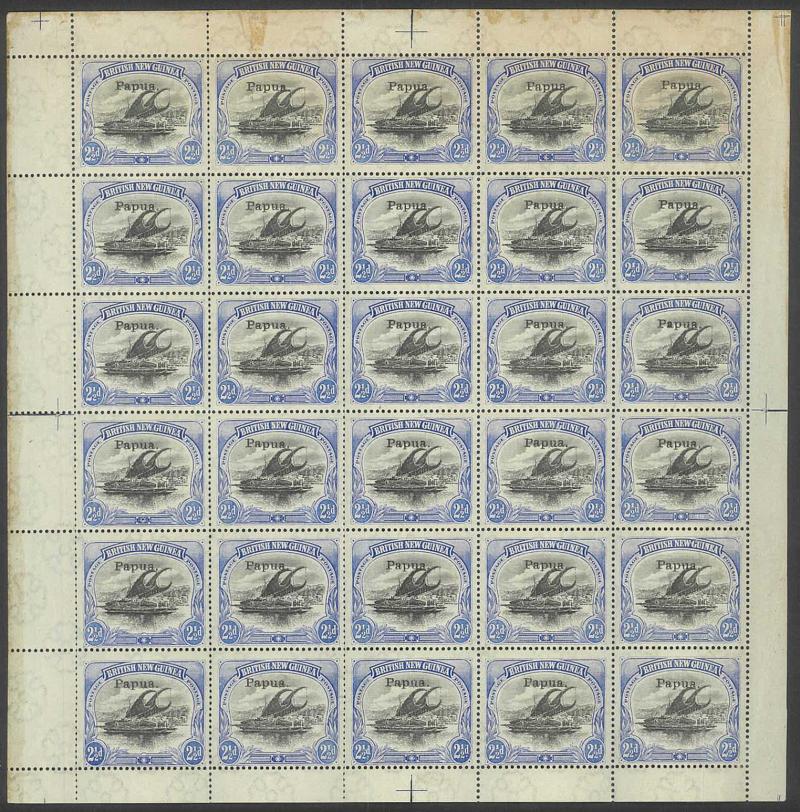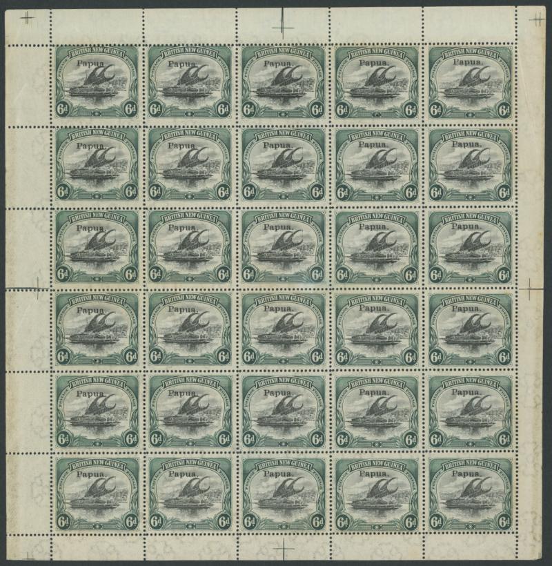 1907 Small 'Papua.' Overprints Watermark Vertical Comb Perf 14 6d black & green SG 43 complete sheet of 30 (5x6) with Printers'
