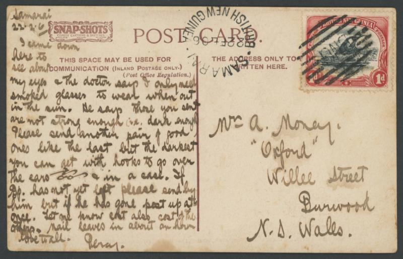 OC2/1905 or DE16/1905 (LRD) or 'SAMARAI/BRITISH NEW GUINEA' cds of 16JA06 (ERD; a gap between types of only one month) or 22FE06, social messages two headed "Mukawa", some minor soiling/toning. Mukawa is on the mainland in Milne Bay Province.