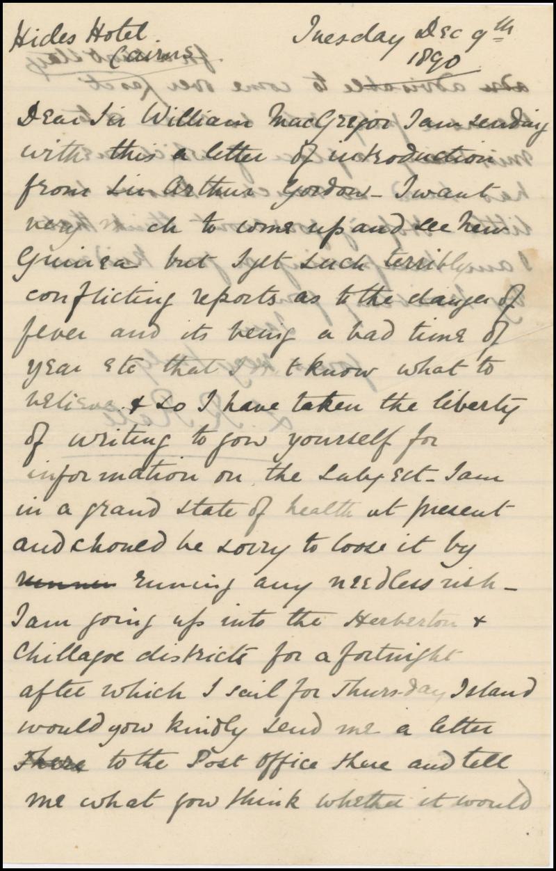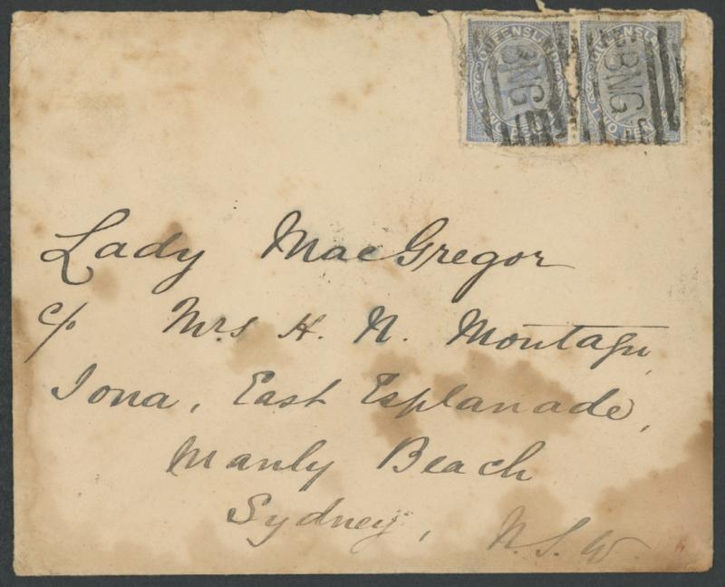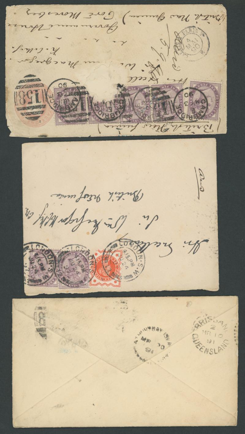 & 'COOKTOWN/QUEENSLAND', the other with 'BRISBANE/MR10/91' & 'THURSDAY ISLAND/MR20/91'; 1890 3pp 8vo letter asking Macgregor his advice whether it would be safe for the writer to visit!; and 1897 from London with Brisbane & 'PORT
