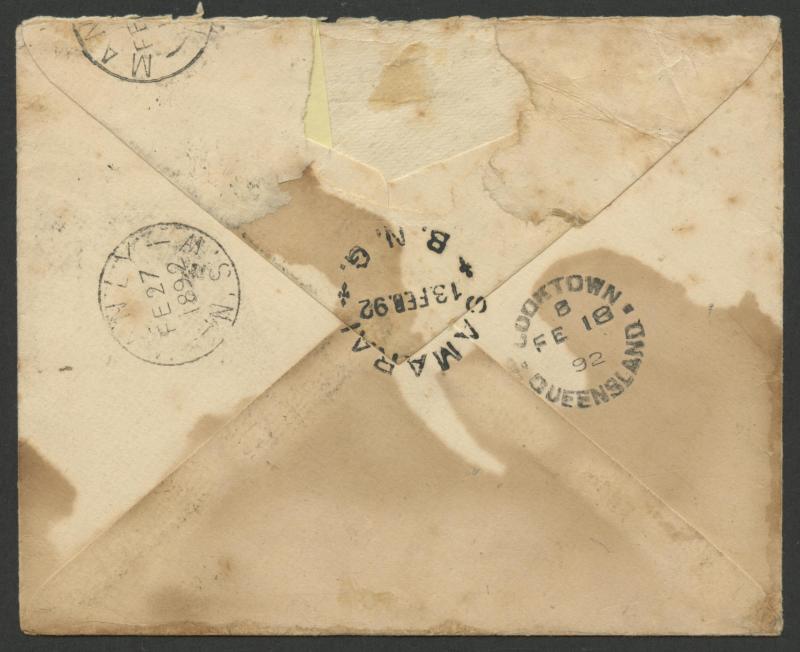 cancel & superb backstamp of the first 'SAMARAI/13FEB92/B. N. G.' cds (with fleurons; Lee #24 ERD), the reverse also with 'COOKTOWN' transit & 'MANLY/FE27/1892/NSW' arrival backstamps, the vice-regal insignia excised from the flap & significant