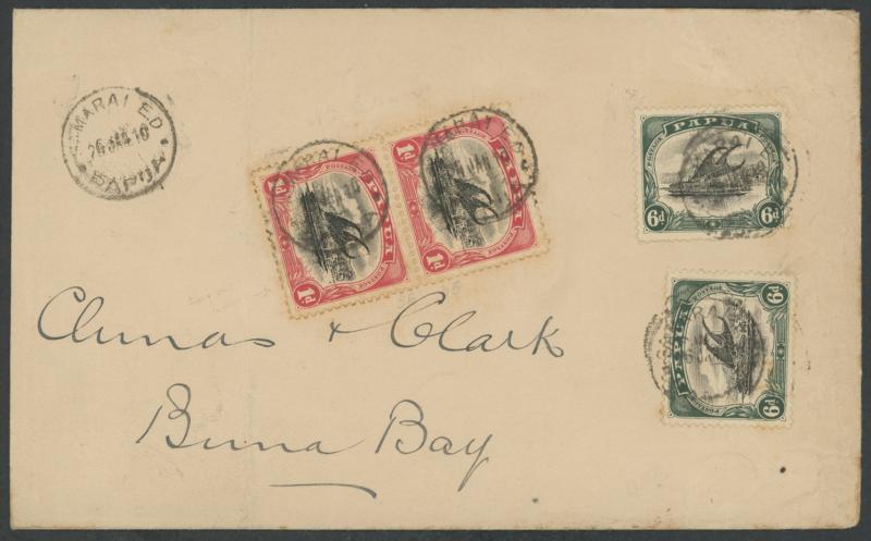 by 'SAMARAI ED/26JAN10/PAPUA' cds, vertical fold clear of the stamps & minor blemishes. Roger Lee states at page 14 that until 31.10.1912, the internal letter rate was 2d per half-ounce, meaning this article weighed between 3 & 3½oz. This is one of