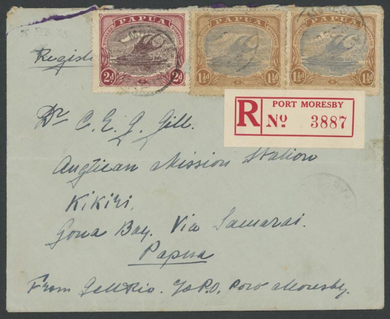 1928 mission cover to "Kikiri/Gona Bay Via Samarai" with Bicolours 1½d x2 (both obviously aged) & 2d tied by Port Moresby cds,
