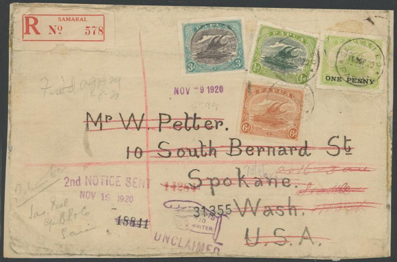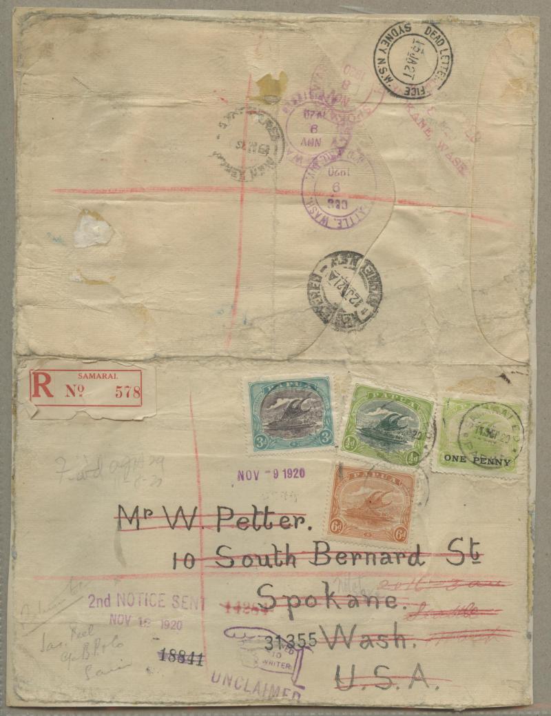 on ½d and Bicolours ½d & 3d tied by 'SAMARAI ED' cds, red/white R label (faults), the reverse with transits of Sydney & Seattle and Spokane arrival, redirected to Seattle with "fickle finger" 'RETURNED/TO/WRITER/UNCLAIMED' cachet in purple with