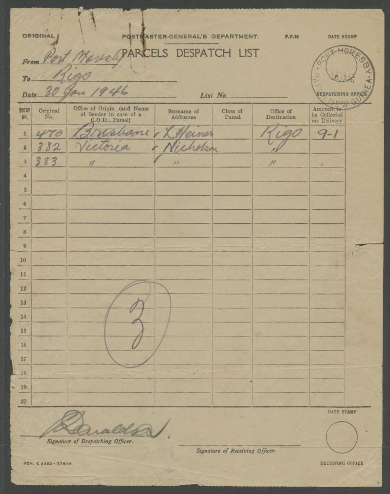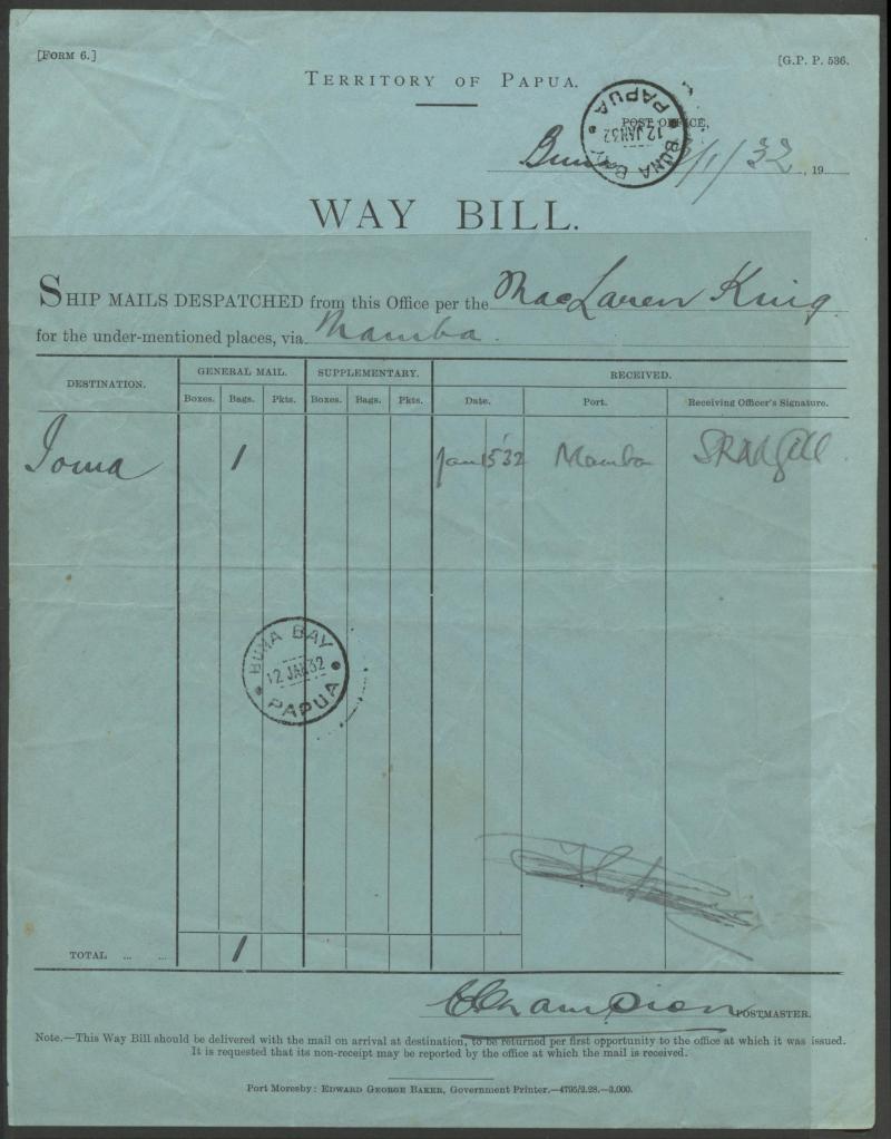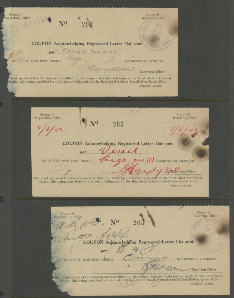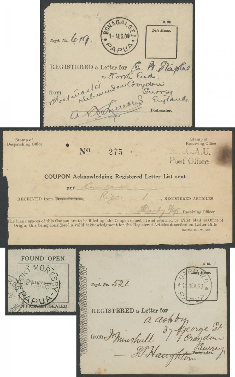 'WAY BILL', WWII 'Coupon Acknowledging Registered Letter List' x10, Registration Receipt x4 including 1909 from 'DARU WD' (stated to be the only recorded example from this office) & 1909 from 'BONAGAI SED', 1946 TPNG 'Pacels Despatch List', Postage
