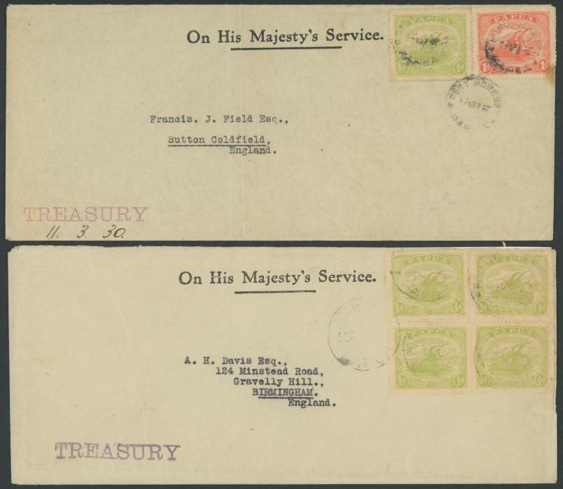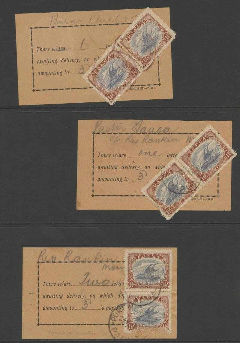 Due dockets x3 each with Bicolours 1½d pair, and a 1935 rare 'FOUND OPEN/OFFICIALLY SEALED' label, postmarks including double-ring 'POST OFFICE/PORT MORESBY, PAPUA' in violet x4 (three different), double-oval 'ASSISTANT RESIDENT MAGISTRATE/RIGO