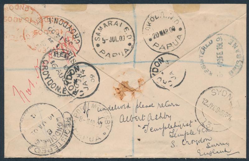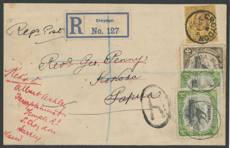 1909 (Jan 14) registered cover from England with KEVII 3d tied by 'CROYDON' cds, to a missionary at "Kokoda/Papua" via Brisbane