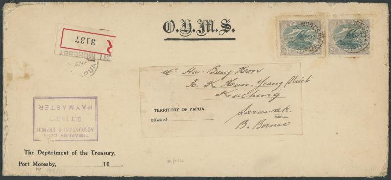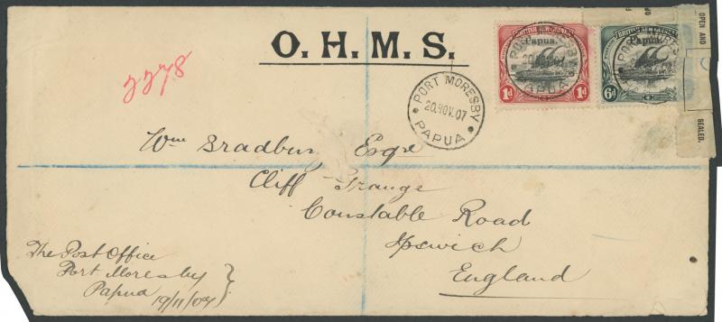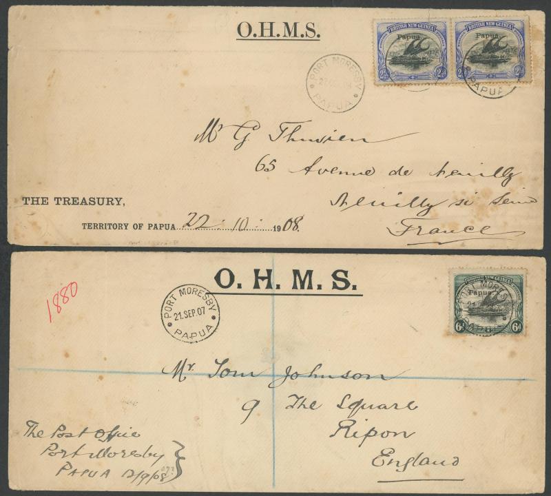 OFFICIAL MAIL: 1907-08 with frankings comprising BNG ½d block of 4 (surface damage) or 2½d pair, and Small 'Papua' Overprints 1d