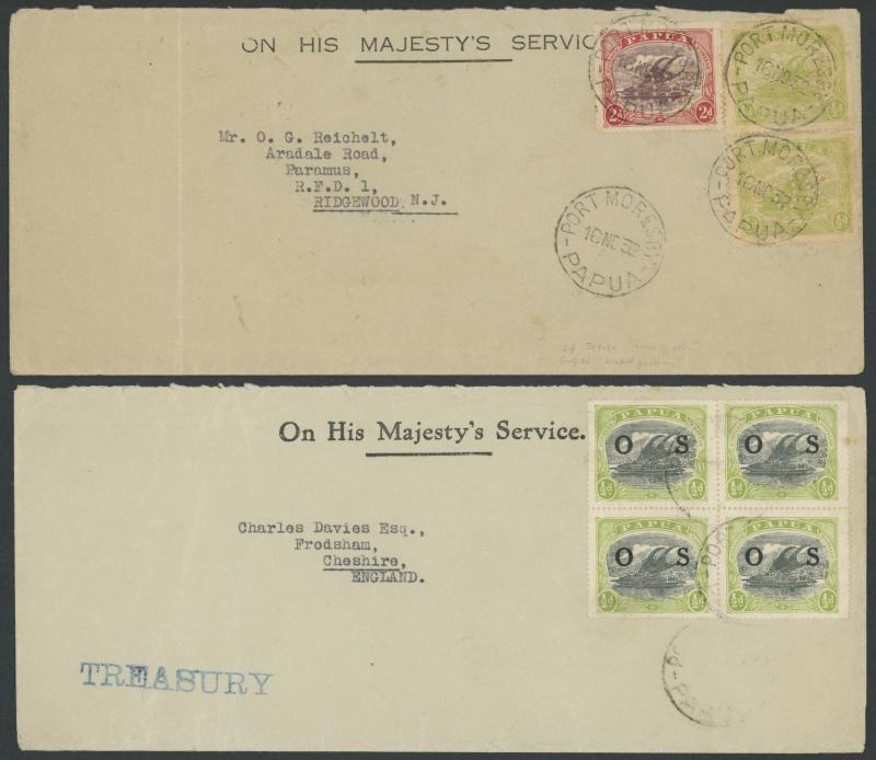 Moresby, 2½d x2, Monocolours ½d & 1d, ½d block of 4, 2d x2 (one a front only) or ½d pair & Bicolours 2d, lastly 'OS' Overprints ½d block of 4; to England x5, New Guinea, USA x3 or France, some variety in flap ornaments, condition variable. The