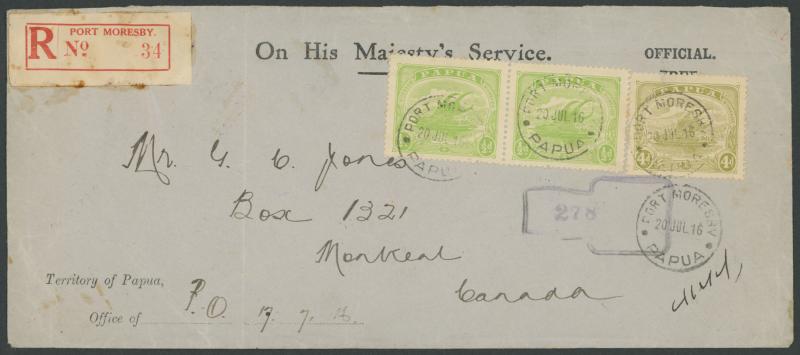 to Samarai, the second registered to Canada with Monocolours ½d pair & 4d partly obscuring 'FREE', the third with 'OFFICIAL/FREE' crossed-out registered to Victoria with Bicolours 3d pair, that & the fourth both also with 'OFFICIAL FREE' on the