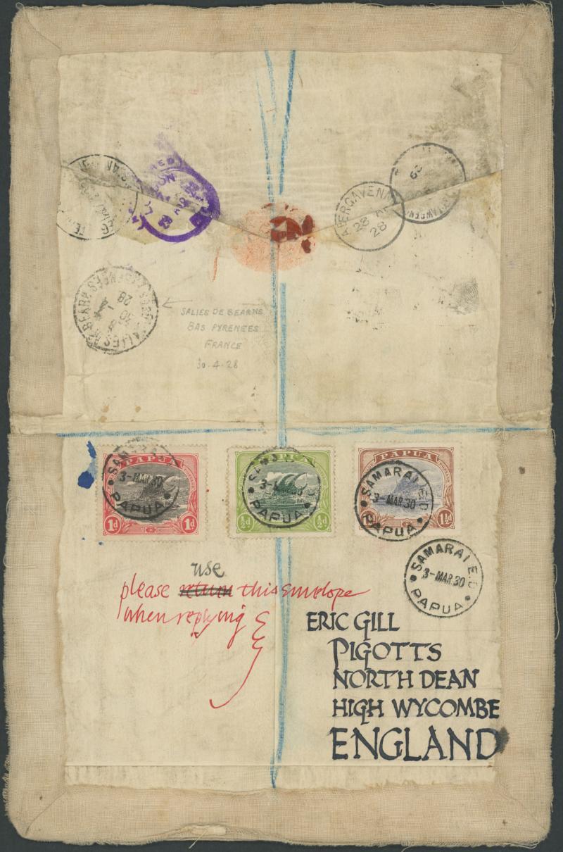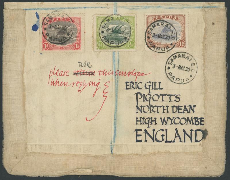 from 'LLANTHONY' (Wales) to "Rev SRM Gill/Anglican Mission/Mamba River/ Samarai/Papua", and two years later re-used by Rev Gill to his brother in England with Bicolours ½d 1d & 1½d tied by 'SAMARAI SED' cds, a bit knocked-about but a truly remarkable