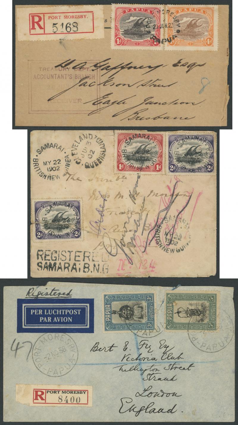 Commercial and official registered covers comprising 1902 to Queensland with BNG 1d & 2d x2 and 'REGISTERED/SAMARAI BNG' handstamp,