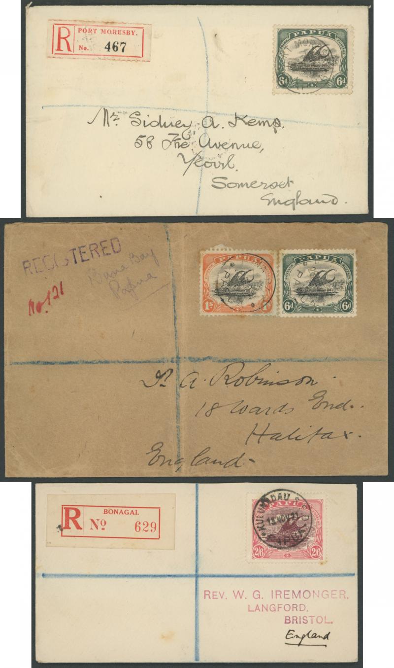 pair, 2½d pair, 6d (Cat £50 x10+ on cover) registered, 6d (Cat £50 x10+ on cover) & 1d registered with two British 'E [crown] R' resealing labels, or with ½d & Large 'Papua' 2d, to England x4, USA x2 or France, condition variable. Very scarce